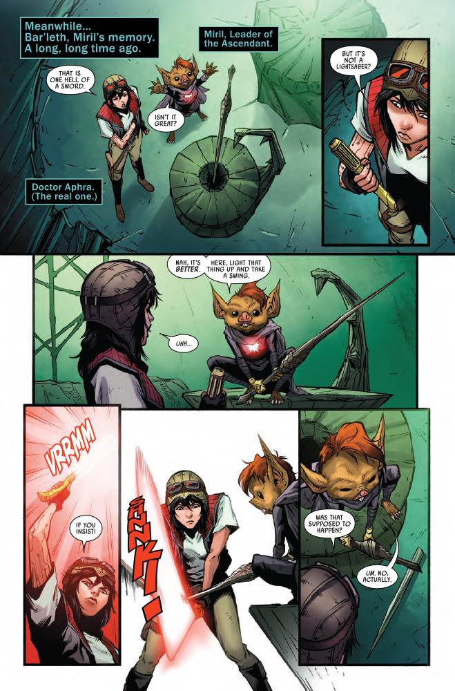 After fighting off the assassin Just Lucky and his partner in crime Ariole Yu, the Spark Eternal sets its sights on Kho Phon Farrus, who’s been collecting numerous Ascendant weapons. Little does the Spark know that Farrus has teamed up with the likes of Sana Starros and Aphra’s other frenemies, exes, family members, and scattered acquaintances like Magna Tolvan, Detta Yao, Eustacia Okka, Chelli’s father Korin Aphra, and those evil, murderous droids Triple-Zero and BT-1. Together this group plans to infiltrate the Vermillion and free Aphra from the Spark Eternal’s grasp. Meanwhile, inside Chelli’s mind, the archaeologist continues to interact with and learn from the Chadra-fan named Miril, who was the creator and leader of the Ascendant “a long, long time ago." Miril tells Aphra about the weapon known as the Null Blade, which can temporarily neutralize lightsabers, though it itself is susceptible to them. She also warns poor Chelli that there may not actually be a way for her to separate herself from the Spark Eternal’s clutches after all.