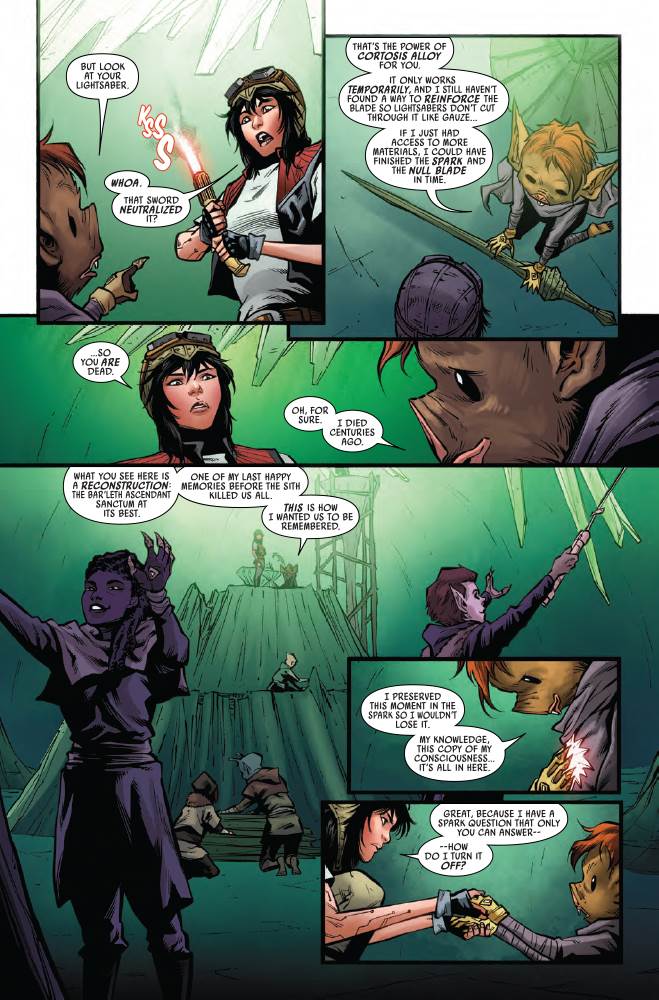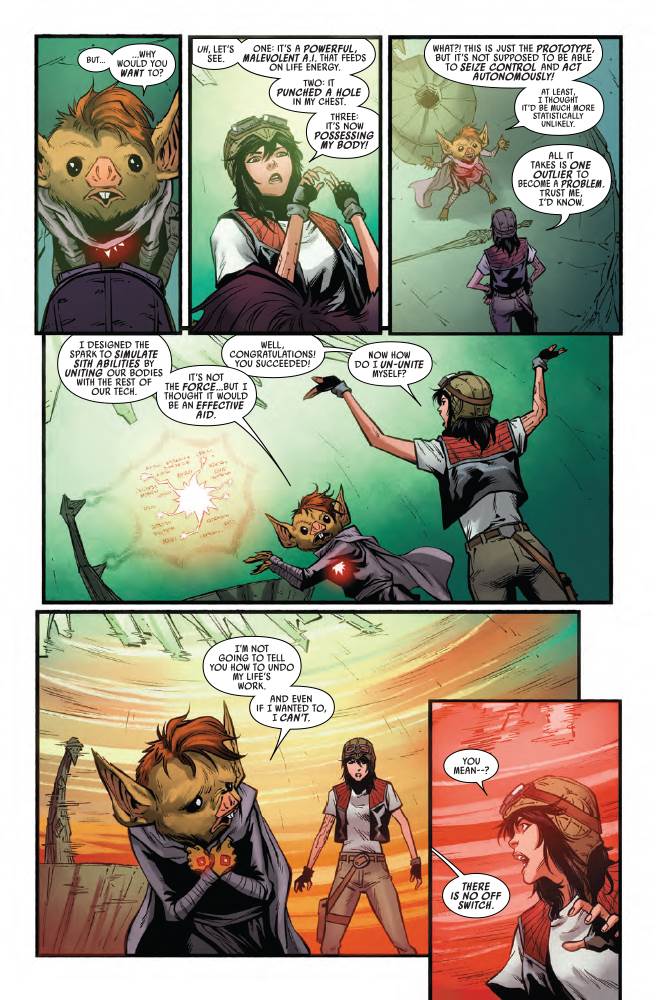 Doctor Aphra #25 starts on the Crimson Dawn flagship the Vermillion, where the title character– rogue archaeologist Chelli Lona Aphra– has been possessed by the Spark Eternal and is seeking to accumulate more technology created by the dark-side cult called the Ascendant.