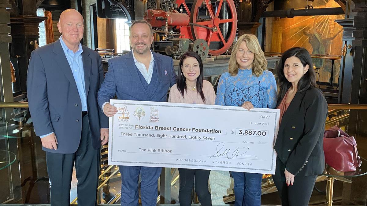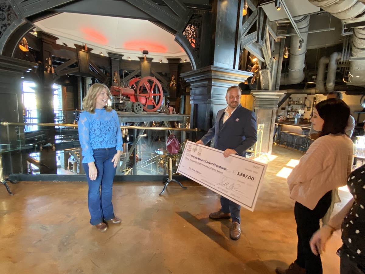 Today, the proceeds of that drink were given in the form of one of those fun giant checks to Tracy Jacim, president and CEO of the Florida Breast Cancer Foundation by the GM of The Edison, Aaron Fert, and the Mixologist behind the cocktail, Alana Sullivan.