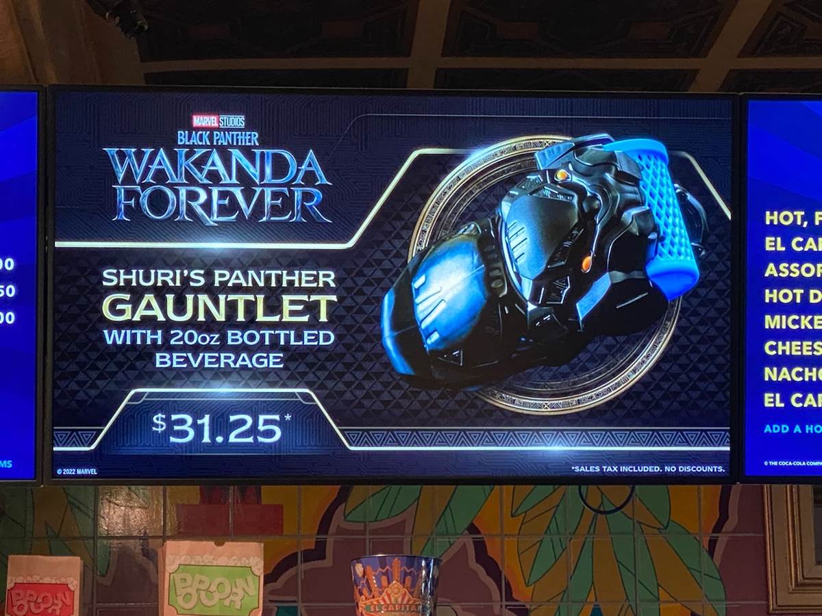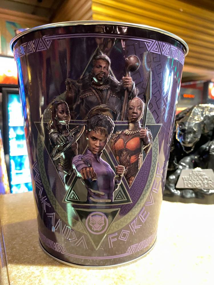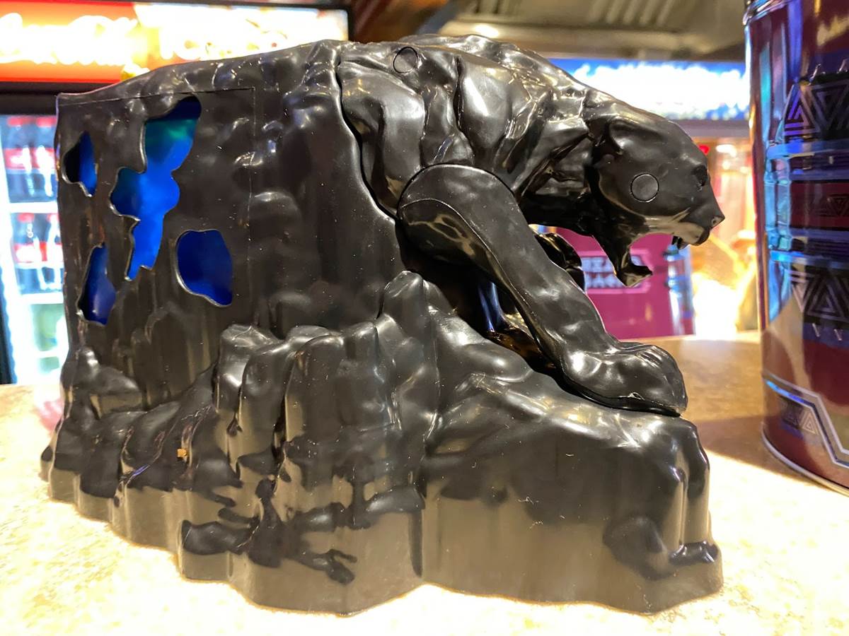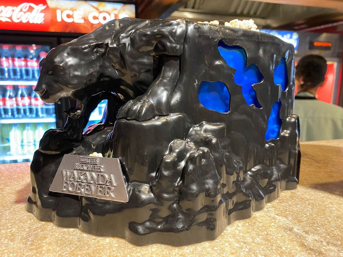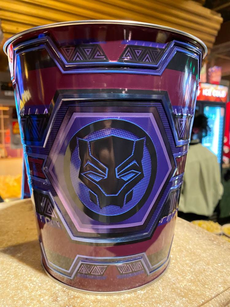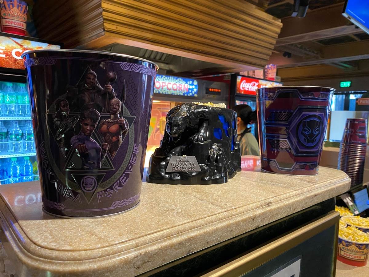 At the concession stand, guests can pick up amazingly cool Black Panther popcorn buckets and other food-related memorabilia tied in with the movie.