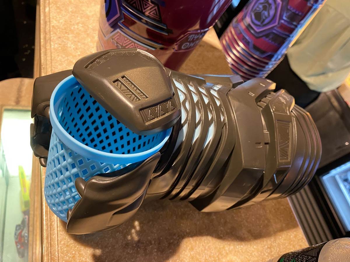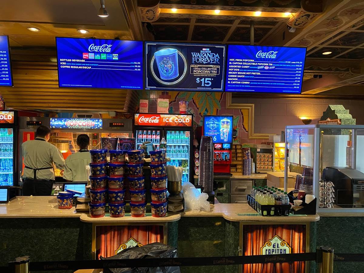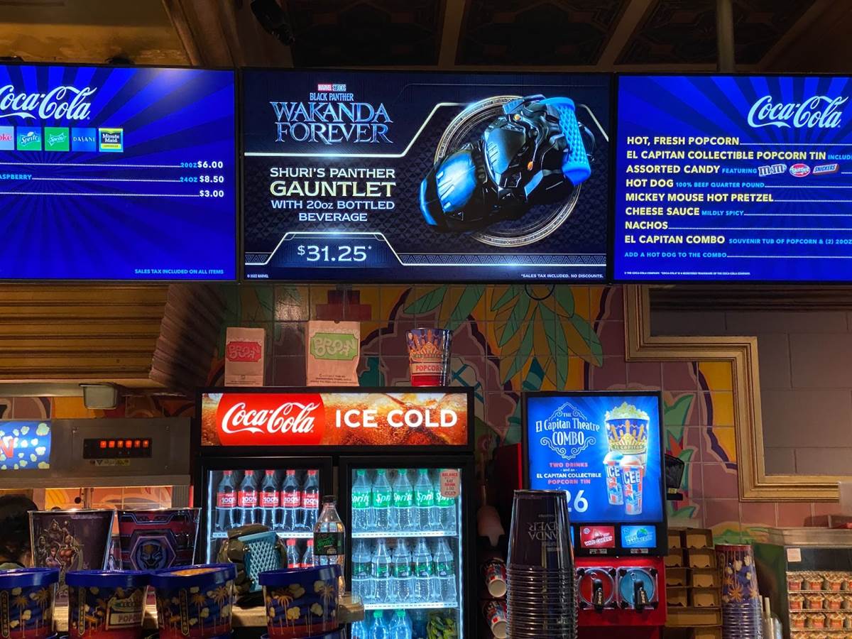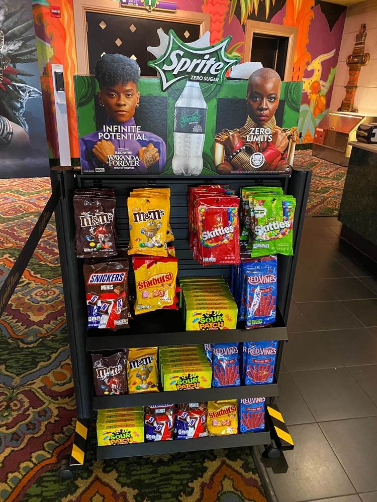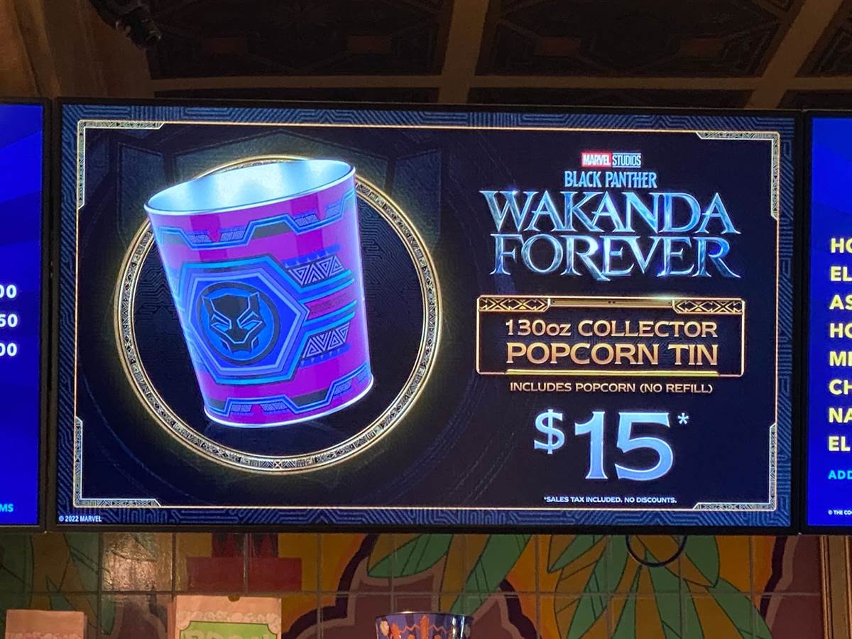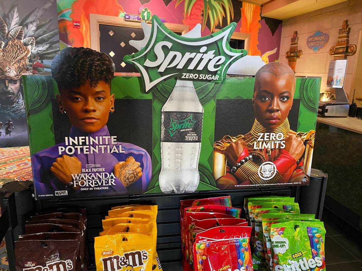 At the concession stand, guests can pick up amazingly cool Black Panther popcorn buckets and other food-related memorabilia tied in with the movie.