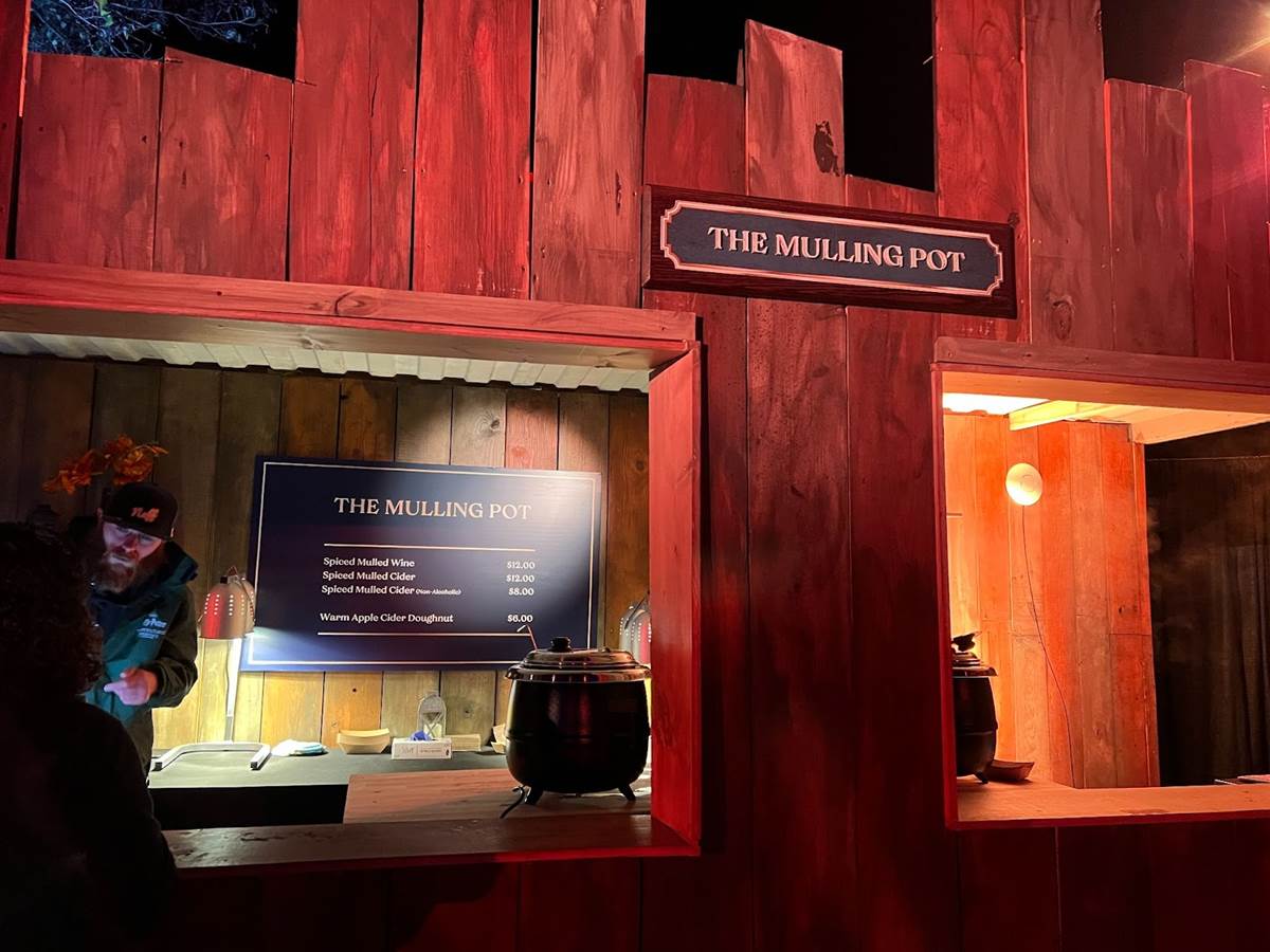 This second village is where the more substantial food items can be found, with options including The Fat Fryer (fish and chips, bangers and mash, cottage pie), Dragonfire Roasts (turkey legs, roasted corn), Forest Fancies (scones, pastries, hot chocolate, coffee, tea), The Mulling Pot (mulled cider and wine), The Bowtruckle Bar (cocktails, wine, soda), and the Sweet Shop (marshmallows to toast at the fire pit).