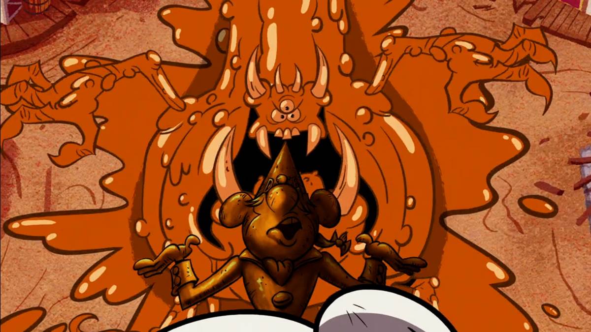 “Oh my Gourd, a giant Mickey," Minnie and Daisy exclaim in unison as they look down and see that’s going on. The house is bulging with the syrup inside. Minnie gets an idea and opens the front door, which faces the town below the hill. The giant pumpkin has Mickey pinned on the ground and is about to drool green glowing spit onto his face. “Everyone was right," Mickey cries, “I’m destined to be a failure." Donald sees the syrup flowing down the hill and grabs a banana, eating it and tossing the peel behind the giant pumpkin. When it takes a step back to avoid the oncoming syrup flood, it trips backward. Mickey jumps to his feet, grabs the statue of Culpepper Mouse in the dunce cap, and stabs the pumpkin with it. The statue disintegrates, the pumpkin explodes, and the bears are released.