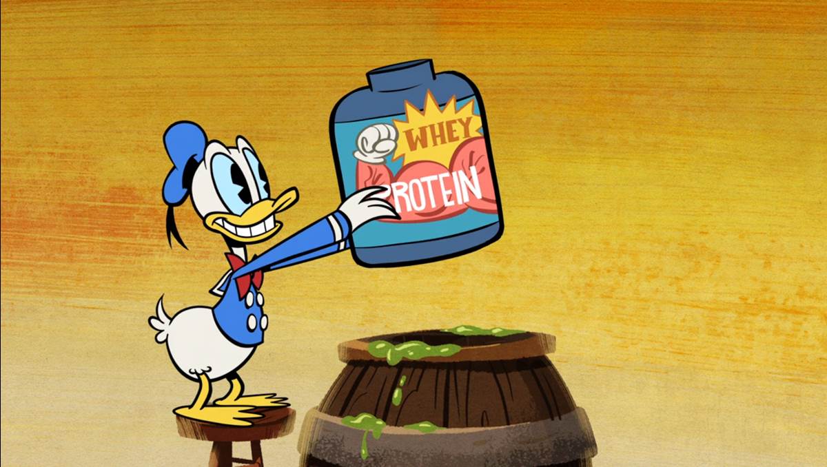 Mickey agrees to use a little of the tonic, but he doesn’t want to cheat. Cut to Mickey and Goofy using farm tools to work the land. Donald fills a barrel with many bottles of his miracle growth tonic, adding in fertilizer, whey protein, and fuel.
