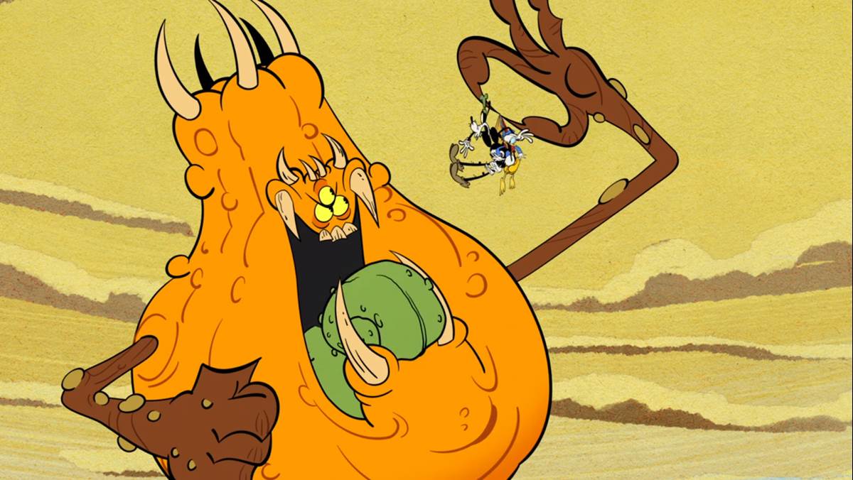 In the morning, the gang feels defeated when nothing has grown out of the ground. Mickey falls to the floor in despair as a sprout pop up before his eyes, It grows fast, curling above his head and dropping a small pumpkin on him. Suddenly, pumpkins begin to rapidly pop out of the ground, and their vines overtake the screen. The pumpkin in Mickey’s hand grows eyes and a mouth and its vines begin to strangle him. All of the pumpkins come to life, surrounding Mickey, Donald, and Goofy. Goofy tries to eat one hole, but it escapes his stomach and knocks over the rest of the barrel of green tonic, which quickly spreads throughout the farm. A giant sentient pumpkin rises up out of the glowing ground.