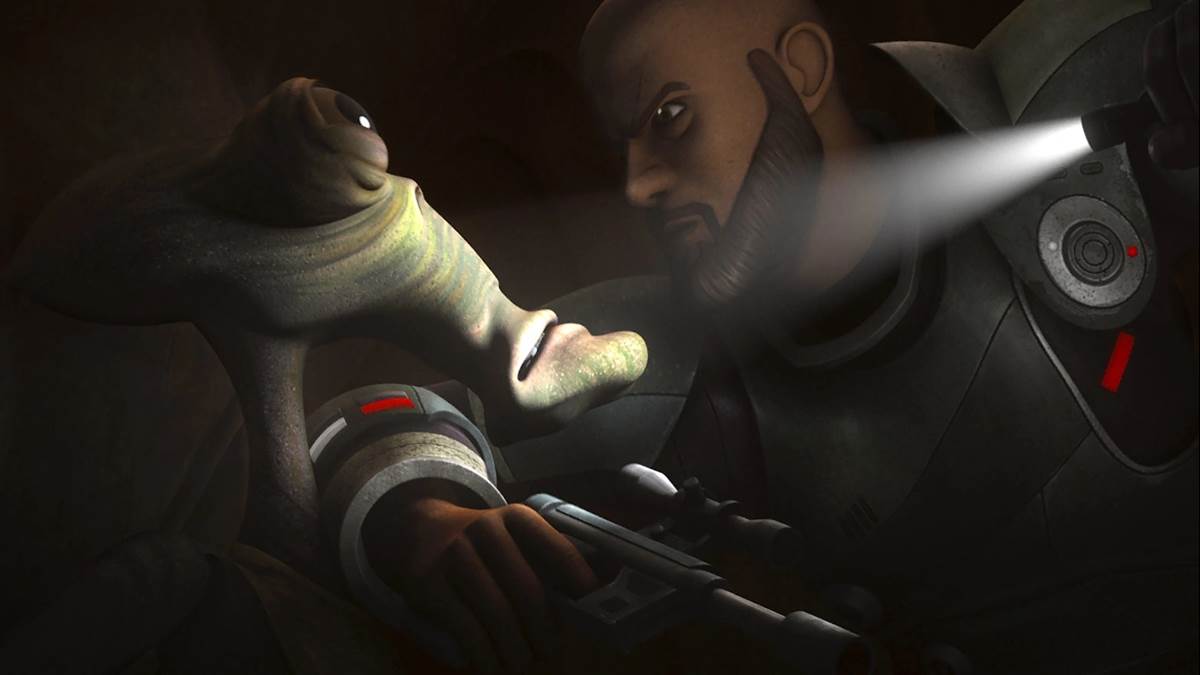 Episode 46: “The Wynkahthu Job" – Ezra and the rest of the Ghost crew agree to work with Hondo Ohnaka (Jim Cummings) again, this time joined by his new partner Azmorigan (James Hong). Together they break into an abandoned Imperial cargo ship, which Hondo promises is carrying much-needed proton bombs for the Rebell Alliance to use. Aboard the ship, the heist seems to be going well until the group is attacked by reactivated sentry droids that resemble the Dark Troopers from Dark Forces and The Mandalorian. Luckily everyone manages to escape, but along the way Ezra realizes that Hondo really only cares about himself and his own wealth.