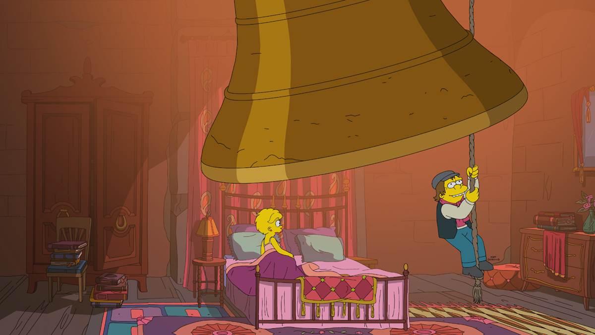 “When Nelson Met Lisa" begins with Lisa rehearsing for her valedictorian speech as she prepares to graduate from an unnamed college, when she runs into her old classmate Nelson Muntz (Nancy Cartwright), who works at the school… pushing stuff… and ringing the cathedral bell every hour– he lives in the belfry as well, though that doesn’t bother Lisa. The two reminisce about the time they once briefly dated, and flames are rekindled, but a hasty decision on Lisa’s part means they don’t see each other for another five years, at which point Lisa is married to a tech guru and Nelson has become half of a married bounty-hunter partnership. There are the requisite jokes about Nelson being a recovering bully, and at this moment in their lives they couldn’t possibly seem like more different people, but we flash ahead yet another five years to find the two meet-cuting in a darkly futuristic take on an Apple Store, owned by Lisa’s dorky and controlling now-ex-husband Hubert Wong (Simu Liu of Marvel Studios’ Shang-Chi and the Legend of the Ten Rings fame). Nelson and Lisa almost fall for each other again, but a last-minute demonstration of devotion from Hubert delays their recoupling until four months later when they attend the marriage of their best friends Jimbo Jones (Pamela Hayden) and Krusty the Clown’s daughter Sophie (Orange Is the New Black’s Natasha Lyonne).
