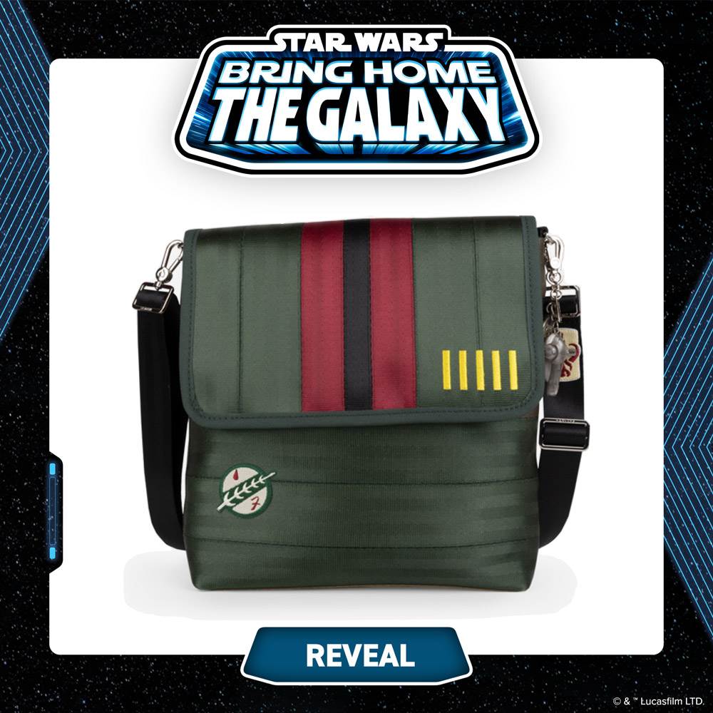 This durable messenger bag, featuring embroidered details on a salvaged seatbelt to recreate the look of Boba Fett‘s battle-worn helmet and armor, is a bounty worth hunting.