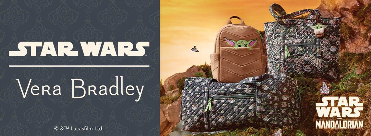 The collection offers Vera Bradely’s signature paisley pattern along with a few other designs patterning Grogu and his silly antics alongside the more reserved Mando.