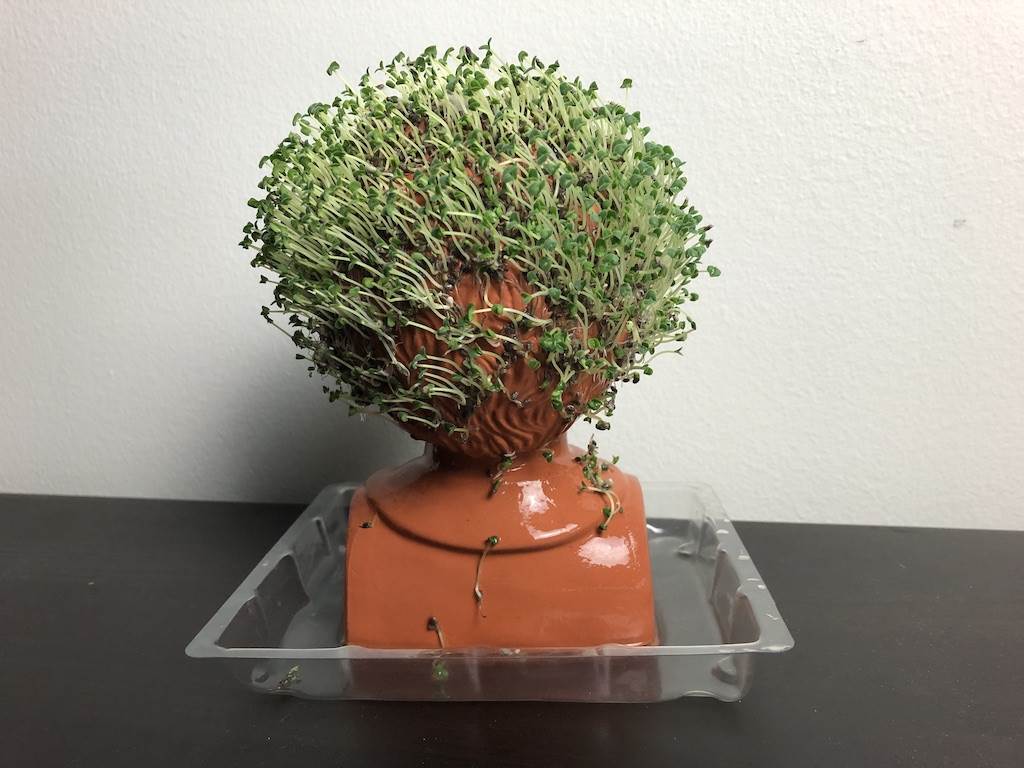 It’s been 10 days and Sophia’s “hair" is growing in! Some of the seeds at the back have fallen off so she won’t have a full head of green sprouts, but otherwise, she’s looking good. I’ll also note that the instructions recommended spritzing the seeds with water daily or covering the bust with a plastic bag so it wouldn’t dry out until the growth began. I must have trapped too much moisture in the bag as some seeds became a little moldy. Whoops.