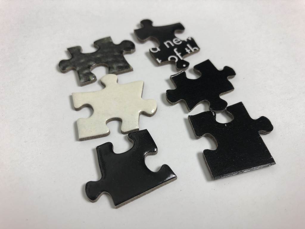 It took me about five days to sort and complete the puzzle working on the front side. The portraits were easy enough, but the black portion was tricky. I ended up further sorting by piece shape and basically tried everything until something fit. It was tedious, but I didn’t hate it.