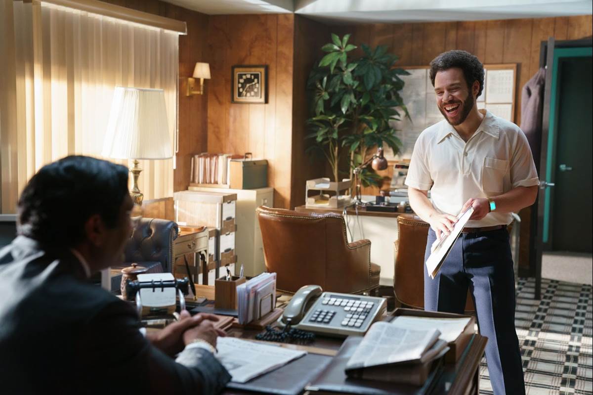 The next morning, Nick walks with Bradford Barton (Andrew Rannells) to the office, stopping for breakfast at a hot dog cart. A group of women recognize Nick from his TV appearances and call out “Hey, Mr. Chippendales." In the office, Nick brainstorms with Bradford and Denise (Juliette Lewis), sharing his frustrations with Steve randomly flying to New York to assert his dominance. With Nick now a recognizable brand, he wants to revisit the idea of leaving Chippendales to launch U.S. Male. “Otis was right, 3,000 miles wasn’t nearly enough," Nick laments. Bradford tells Nick about a friend who was in a touring production of Evita, which gave him the idea for a touring version of Chippendales. “A different city every night," Bradford says. “Not a Banerjee in sight," Denise rhymes.
