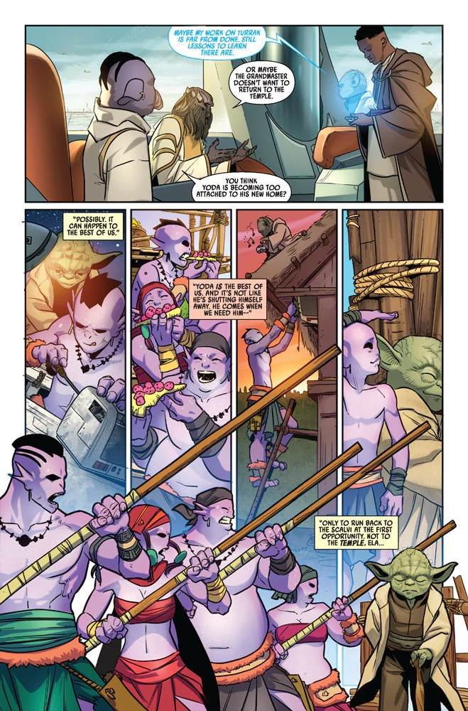 In last month’s debut issue of Marvel Comics’ Star Wars: Yoda miniseries by Cavan Scott, the diminutive green Jedi Master decided to take up residence on the planet Turrak to help the native population there, known as the Scalvi, continue to fend off bloodthirsty raiders called the Crulkan.