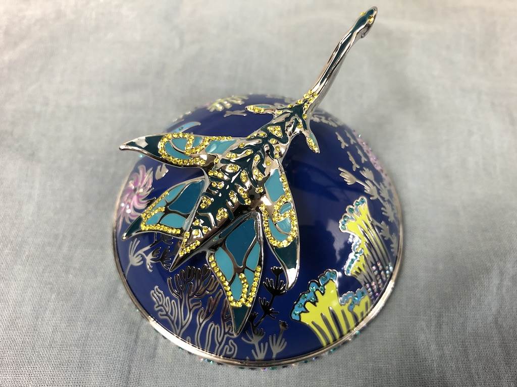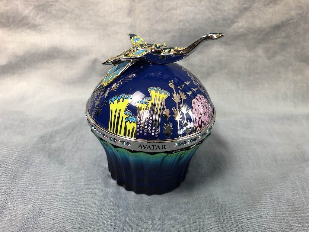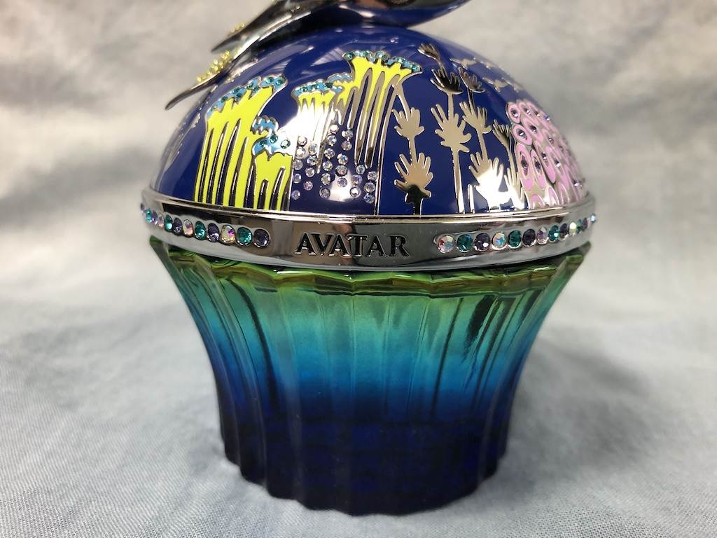 As for the bottle itself, the cap features an Ilu, a new creature to the Avatar universe, gliding gently on the surface of the dome. It’s surrounded by corals, fish and aquatic plants that are in full bloom. Around the base of the lid are white, turquoise and purple Swarovski crystals and the word “Avatar." The cap sits atop French glass that’s been “hand polished in ombre lacquered finishes of blue, green, and yellow." It’s designed to remind you of Pandora’s oceans and succeeds in this mission.