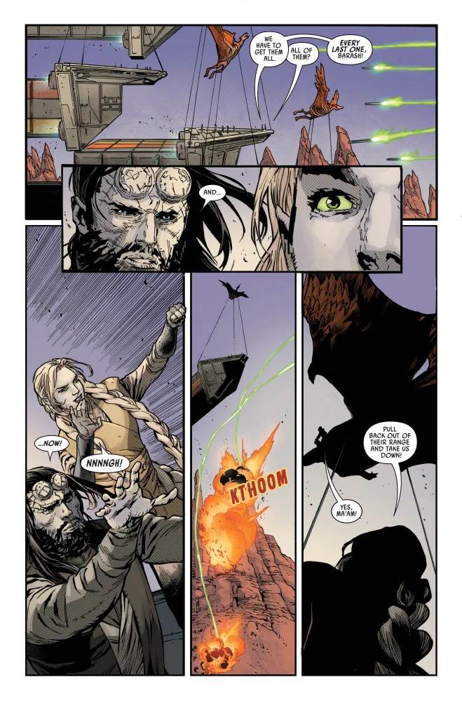 Back in the “present," Engle and Silvain convince Tozen to allow them to travel into Firevale and deliver the much-needed survive, on the condition that they retrieve the supposedly kidnapped princess of the Bethune people. Of course, the residents of Firevale and that land’s own royal family have a very different perspective on just how this whole mess got started, but the Jedi don’t have much time to sort all of it out before Tozen betrays their trust and calls in a fleet of mercenary ships to attack the city. There’s a lot going on here, and quite a bit of it reminds me of the war between Eiram and E’ronoh that we’ve seen plenty of in other The High Republic books and comics, but Soule also references that particular conflagration here, so I’m guessing (not to mention hoping) he has something very different up his sleeve for the outcome. There’s a tease on the final page of this issue of a new Mirialian antagonist who appears to be the leader of the mercenary troops, so she may turn out to be a pretty interesting character. And though this issue sets up a lot more than it pays off, I’ve learned to trust Charles Soule enough to let him take us on this journey and try not to worry too much about where it’s going. In the meantime, this is already a fun adventure punctuated by some exciting action by way of Porter Engle and his undeniably substantial saber skills.