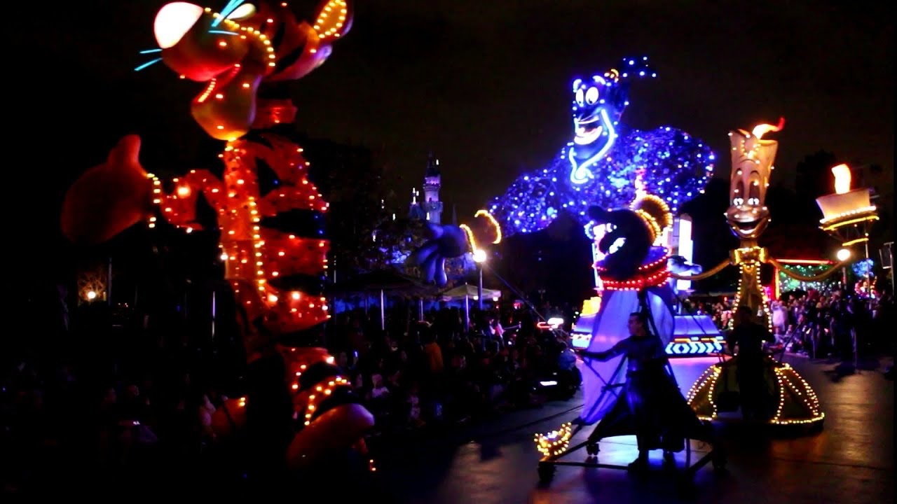 The 15ish-minute show would lead the crowd in two songs, one of which might have been a bit familiar to long-time Disneyland fans as the music from Party Gras, the park’s 35th anniversary celebration. Though, the lyrics have been changed from “Party Gras" to “Carnivale." The real highlight though were the towering, glowing puppets of favorite characters who lead their appropriate color sections. Mike Wazowski for Green, Tigger for Orange, Sebastian for Red, Genie for Blue, and Lumiere for Yellow.