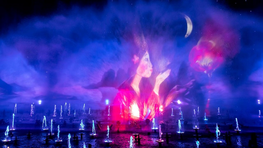 With that, as she moves around the space, other show elements kick in, giving the whole environment a depth that is what the whole of the World of Color infrastructure is meant for. Lighting on the Pixar Pal-A-Round and the Incredicoaster combined with projectors, lighting, and lasers from the water’s edge combine to make starfields come to life on the water and the mist. Which is appropriate, considering one of the characters in the film is Star, a wishing star that has come to life, albeit a bit more animated.