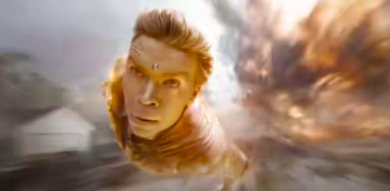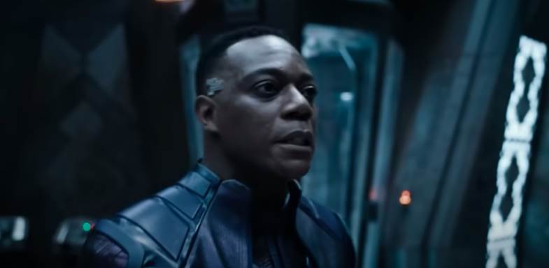 Warlock appears to be destroying a town, likely the animal hybrid-inhabited town we saw in the previous trailer, as he chases the Guardians. We see Gamora running back to the Bowie, holding a seemingly unconscious Rocket.