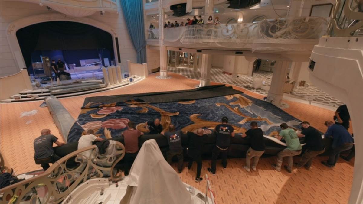 There’s a memorable scene in “Making the Wish: Disney’s Newest Cruise Ship" when the carpet is rolled out into the Grand Hall. With documentaries, there are no second takes. The film crew found out the previous night that the carpet would be rolled out that day, so they made sure to have cameras in place to capture it. But they ended up waiting a long time as things often take longer than expected. They were, however, entertained by the carpet vendors who were from England and were “hilarious." In the end, they got the memorable shots they were after.