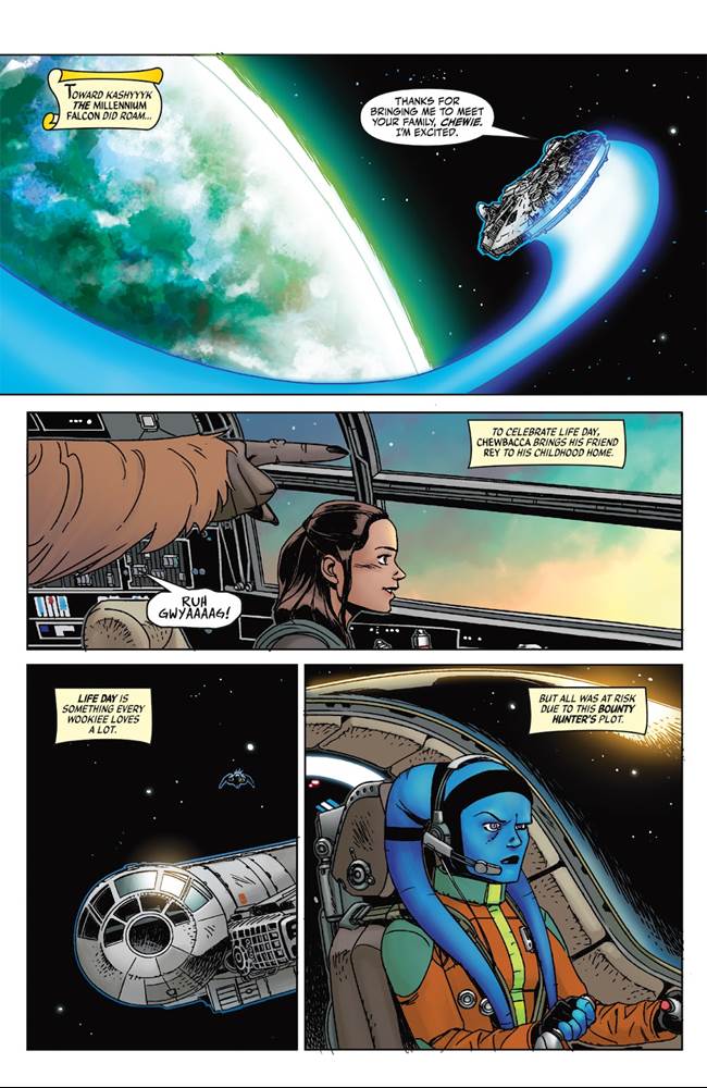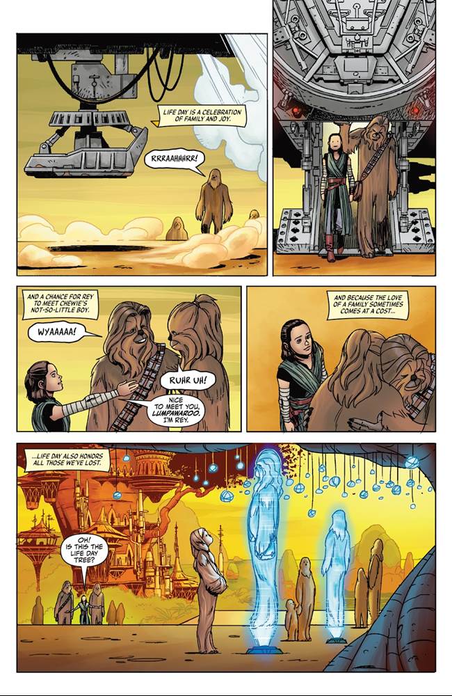 Star Wars: Hyperspace Stories #4, out last Wednesday, sees Rey bringing Chewbacca home to the Wookiee planet Kashyyyk for Life Day– much like Han Solo did with Chewie in the aforementioned Holiday Special– during the period set between the events of Star Wars Episodes VIII and IX.