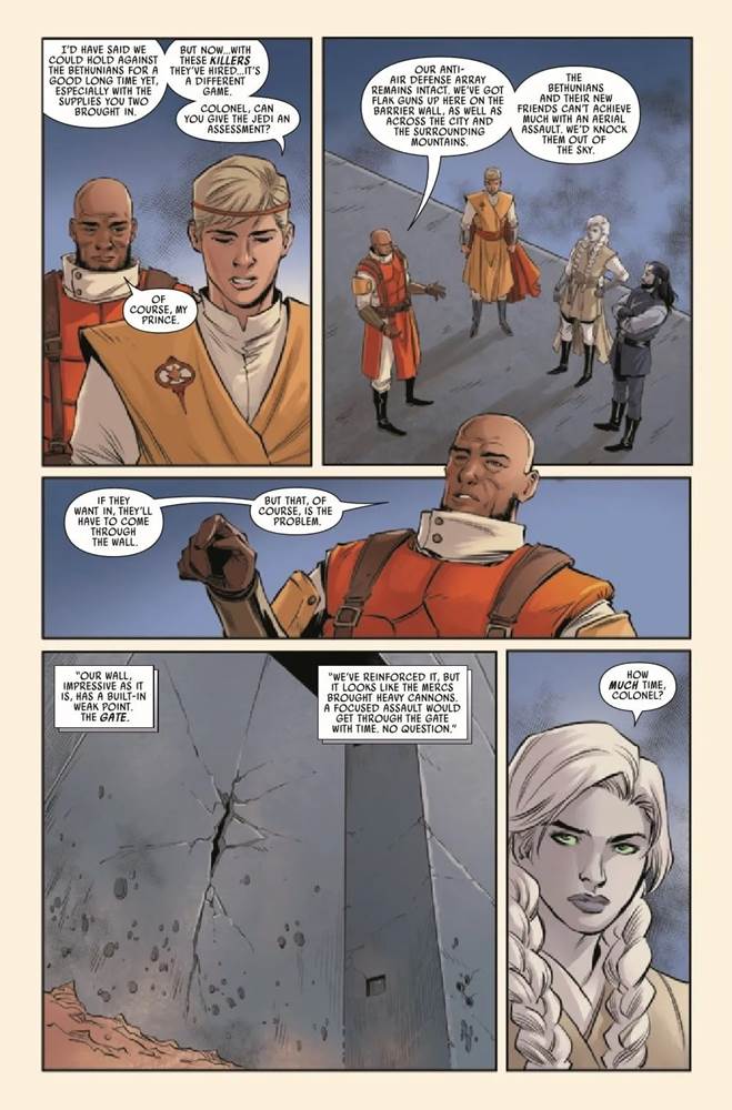 The High Republic - The Blade #3 begins with the two Jedi looking out over the mercenary army that the Bethunian side of the conflict has enlisted to attack the city of Firevale, whose prince claims that his wife– the heir to Bethune– has come there on her own volition. In order to stall the assault so Barash can investigate further, Porter descends to the ground below and talks with the invaders– after skillfully deflecting their blaster bolts, of course, once again earning his titular nickname, the Blade of Bardotta. Meanwhile, Barash meets with Firevale’s royal family and its new member, determining that the star-crossed couple had fled Bethune fearing danger to both themselves and their unborn child. We then get a flashback to 15 years earlier in the Jedi Temple on Coruscant, with writer Charles Soule filling us in on how exactly Silvain and Engle came to think of each other as brother and sister, despite being two completely different species from other worlds. This interlude gives a little more context to the proceedings on Gansevor, where Barash decides that this particular war is indeed no longer worth fighting.