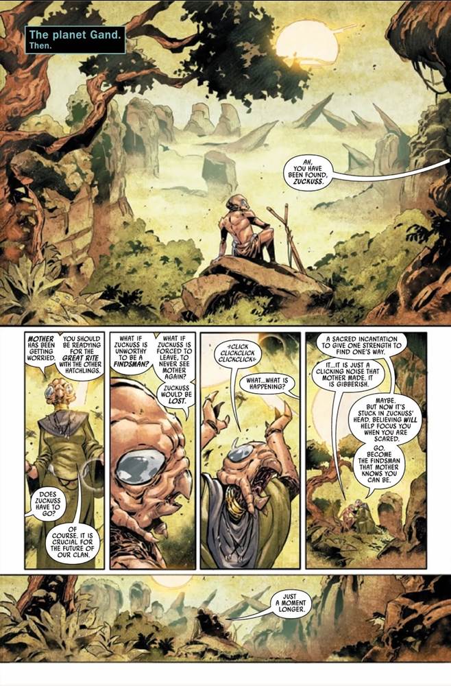 Bounty Hunters #32 begins with a flashback to the planet Gand, where a young Zuckuss is called by his brood Mother to participate in a tribal ritual called the Great Rite.