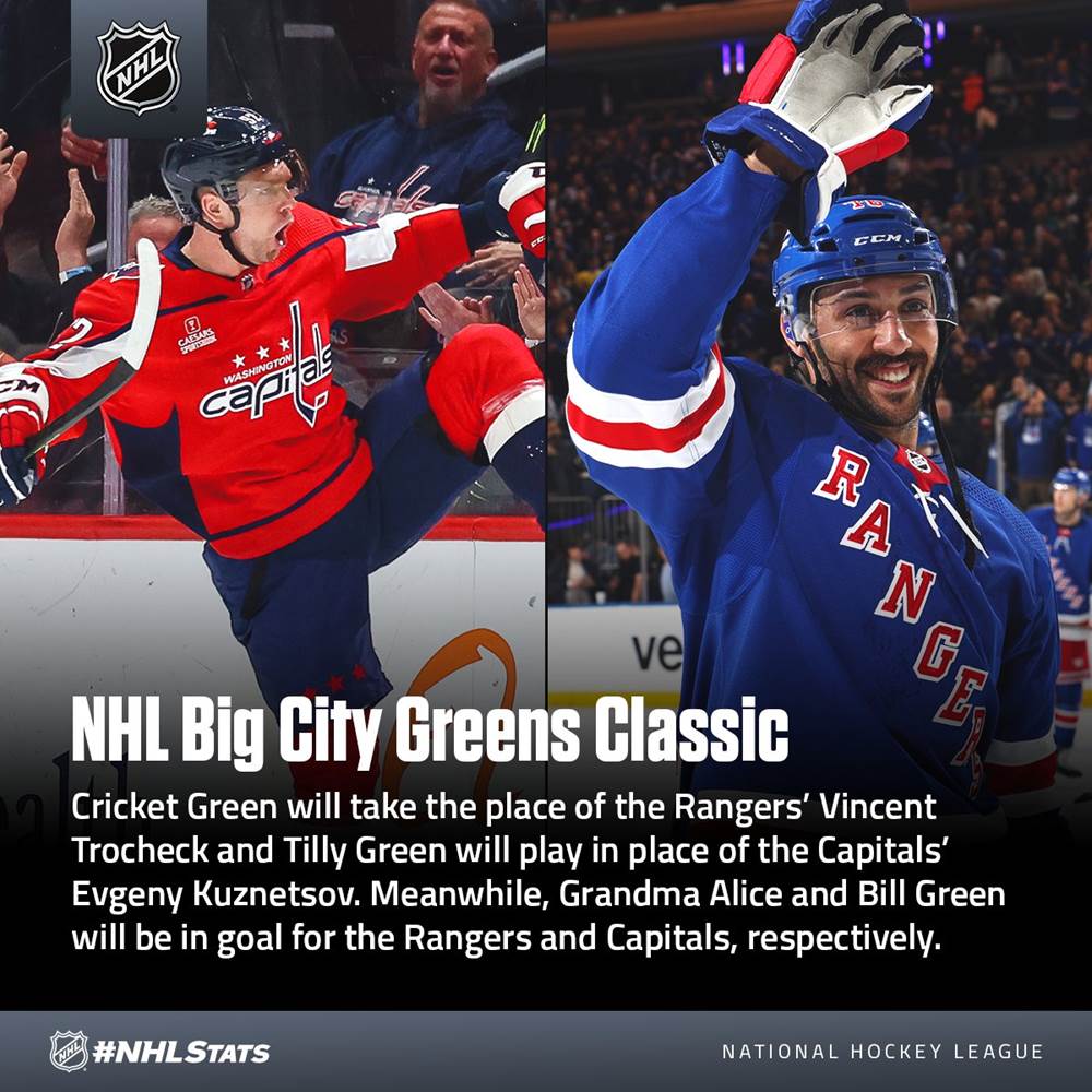 The real version of the game aired simultaneously on ESPN and ESPN+ while the NHL Big City Greens classic aired live on Disney Channel, Disney XD, Disney+, and ESPN+. Called by commentators Drew Carter and Kevin Weekes, the game followed the human version to the tee with a few notable differences. Namely that Cricket Green was actually the track of the Rangers’ Vincent Trocheck, and Tilly Green in place of the Capitals’ Evgeny Kuznetsov. The goalies for each team were also replaced, with Bill siding with the Capitals and Gramma for the Rangers. Later in the game, Gloria and Remy also filled in on the ice briefly.