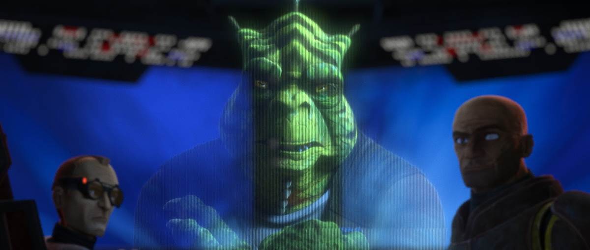 From that point, the pirate character of Phee Genoa (voiced by recurring guest star Wanda Sykes) discovers that the Bad Batch and Omega (Dee Bradley Baker and Michelle Ang, respectively) have ended their fraught working relationship with Cid (Rhea Perlman) after the Trandoshan crime boss left them for dead during a previous mission. Phee says she’s known Cid a long time, and it’s a dangerous idea to get on her bad side, so she offers the current makeup of Clone Force 99 a safehouse on her home planet of Pabu– hence the title. The team arrives on Pabu to find a peaceful, picturesque island community run by a friend of Phee’s named Shep Hazard (Imari Williams from Transformers: Rescue Bots). And after spending some time drinking in the local culture– not to mention eating a feast so bountiful it even made Wrecker full– the Bad Batch seriously starts to consider settling down on Pabu. What makes things even more appealing is that Omega has started forming a fast friendship with Shep’s daughter Lyana (Andy Allo of Upload fame). But as we all know from the history of storytelling (and real life, for that matter), when things seem too good to be true, it probably means they are.