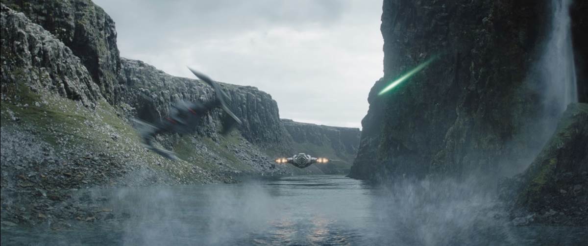 But first we check in on Din Djarin (Pedro Pascal) and Bo-Katan Kryze (Katee Sackhoff) on Mandalore, where the latter is still reeling from having gotten a peek at a living Mythosaur in the Living Waters.