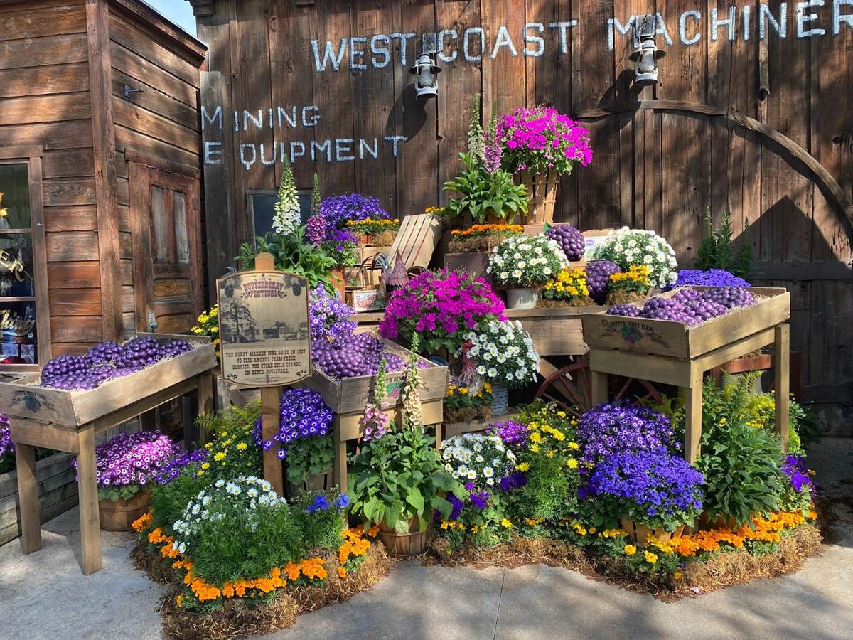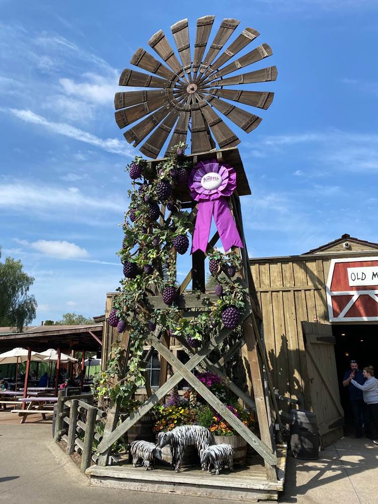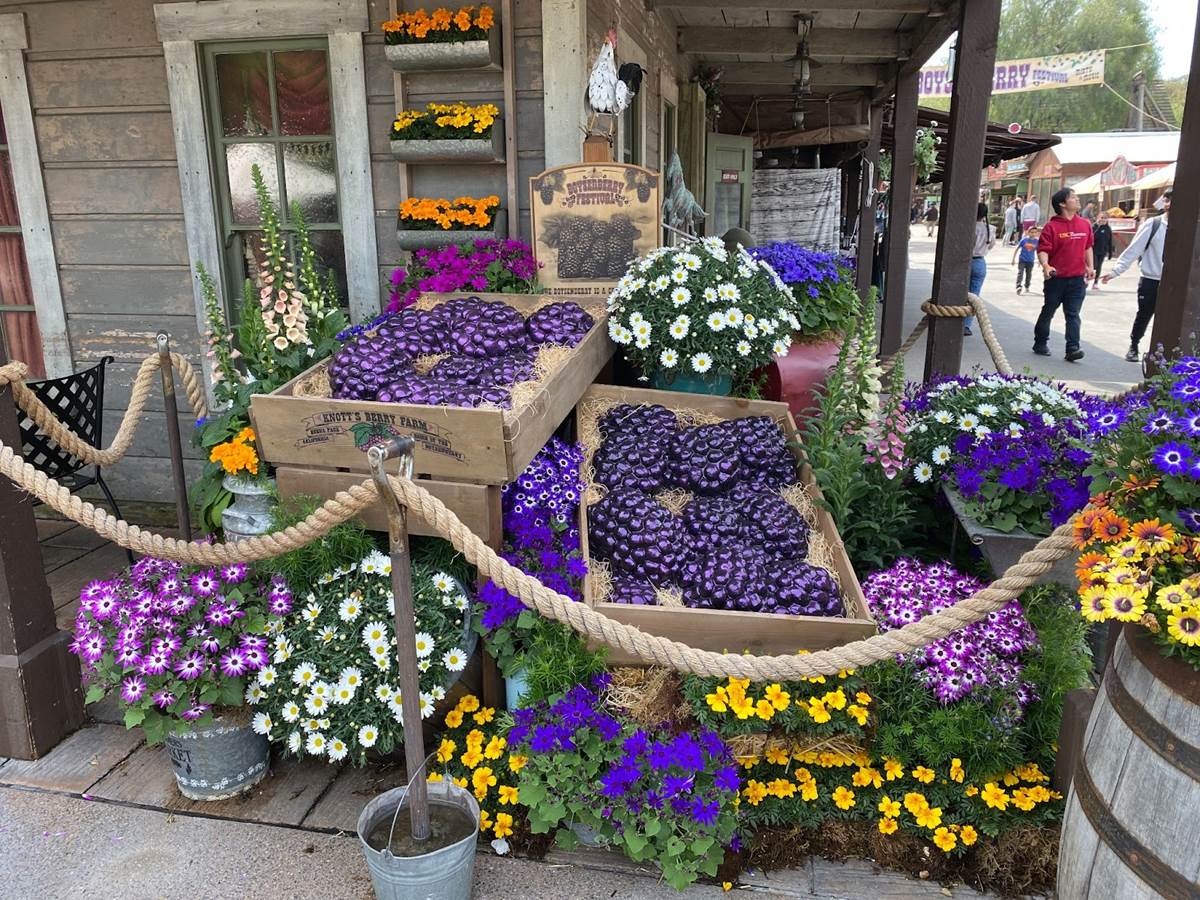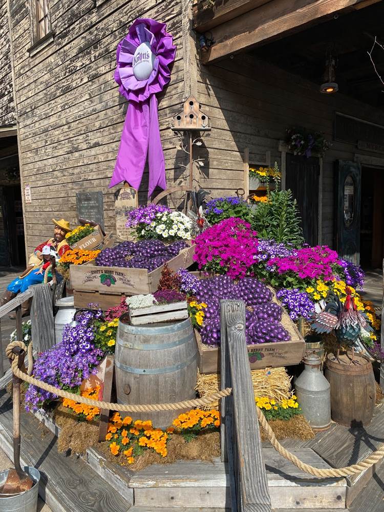 Inside Knott’s Berry Farm, we walked through the classic Ghost Town area and took in the sights, which included more Boysenberry Festival decor such as purple ribbons and lovely floral arrangements.