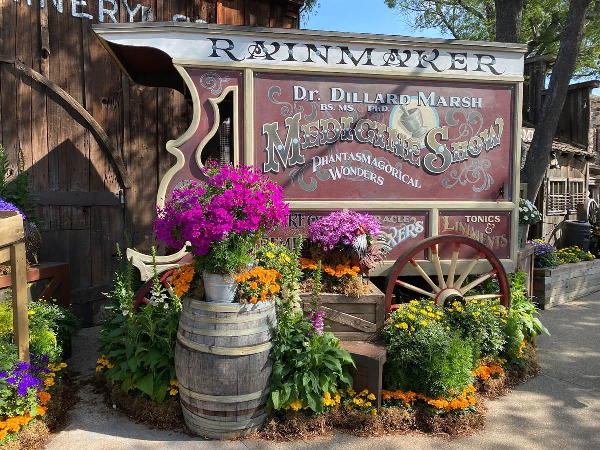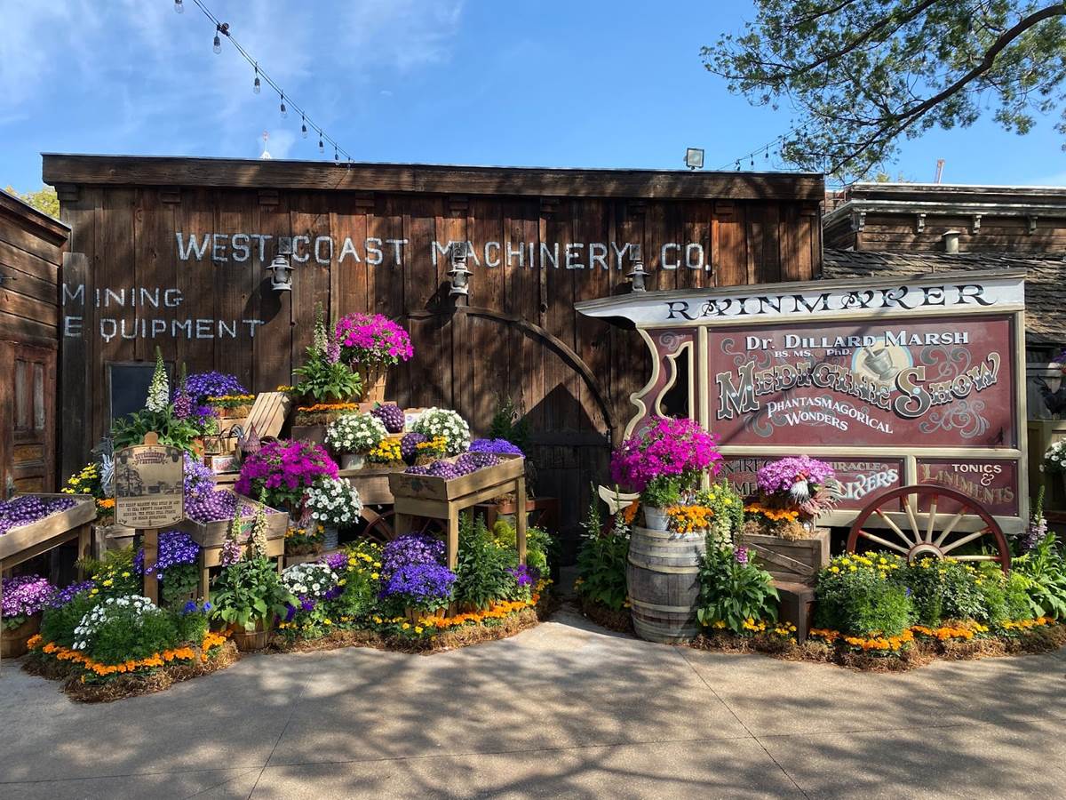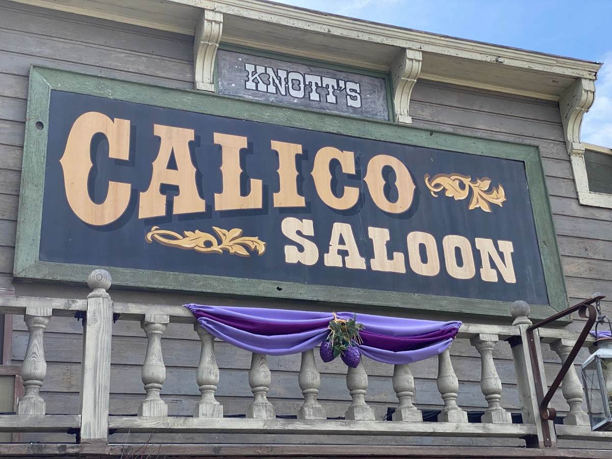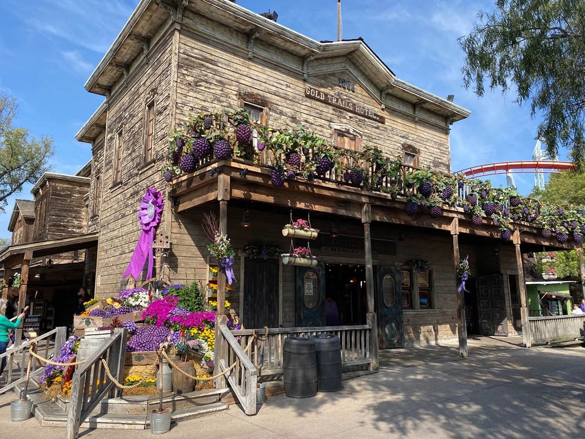 Inside Knott’s Berry Farm, we walked through the classic Ghost Town area and took in the sights, which included more Boysenberry Festival decor such as purple ribbons and lovely floral arrangements.