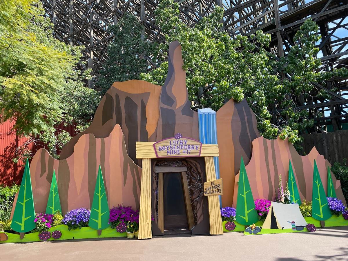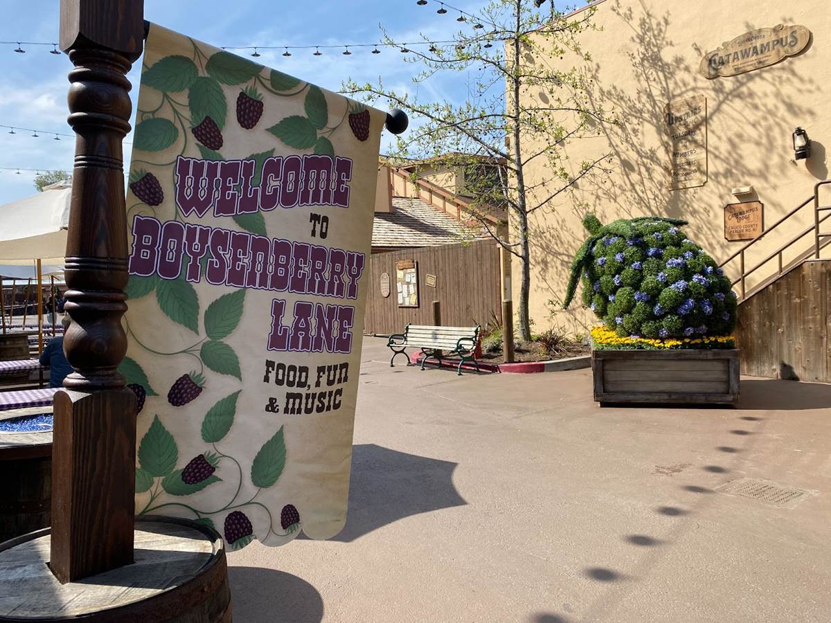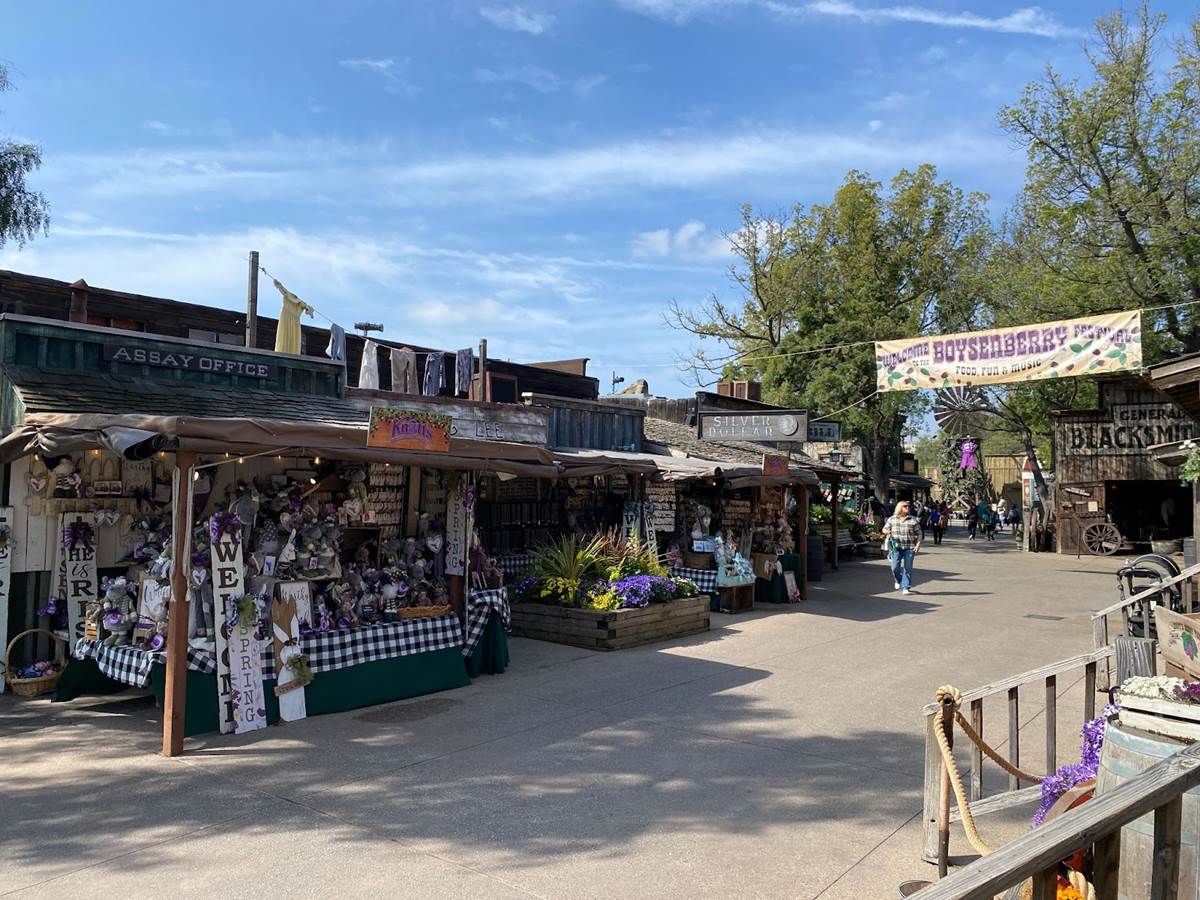 The Boysenberry Lane area, located near the Ghost Rider roller coaster, offers picnic-table seating, themed carnival-style games, boysenberry plants for guests to take home for their own gardens, craft shops, and a meet-and-greet spot with the character known as Whittles the Prospector.