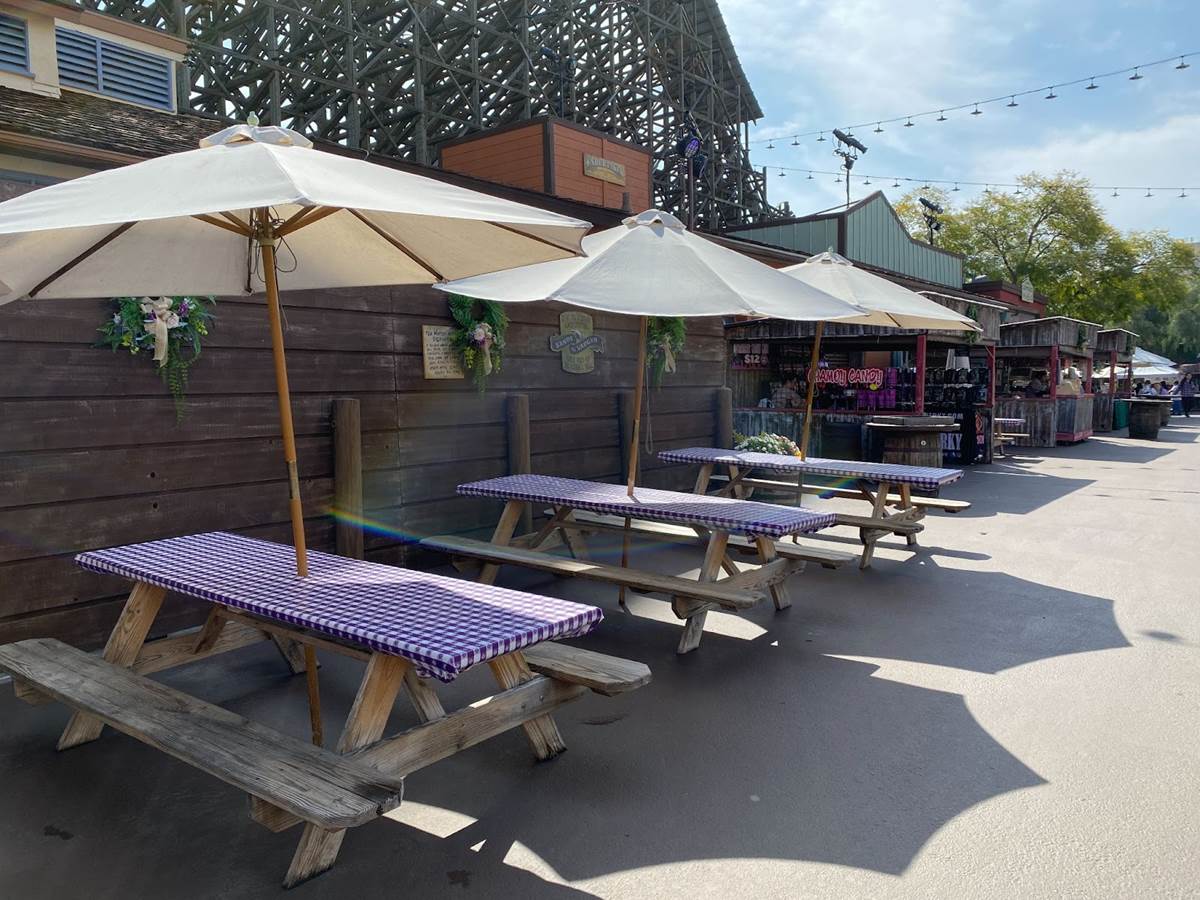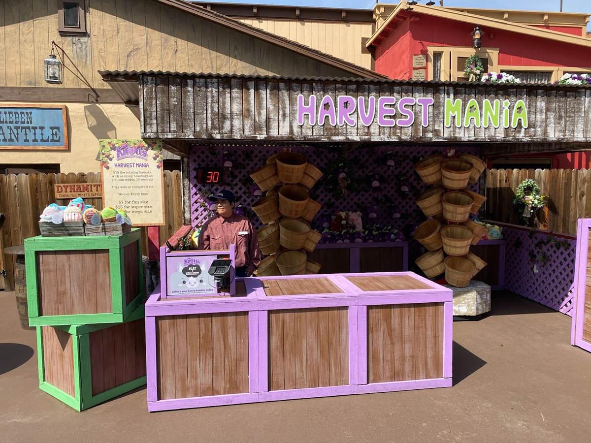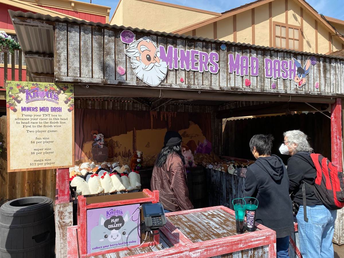 The Boysenberry Lane area, located near the Ghost Rider roller coaster, offers picnic-table seating, themed carnival-style games, boysenberry plants for guests to take home for their own gardens, craft shops, and a meet-and-greet spot with the character known as Whittles the Prospector.