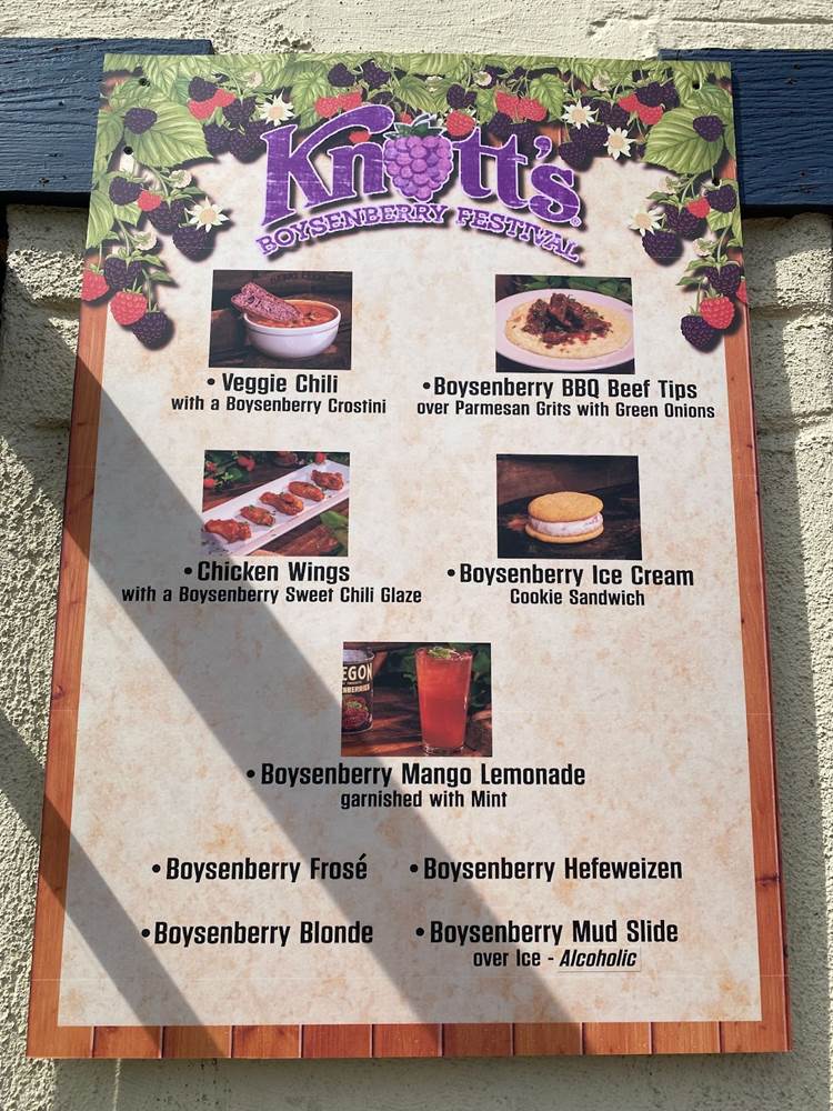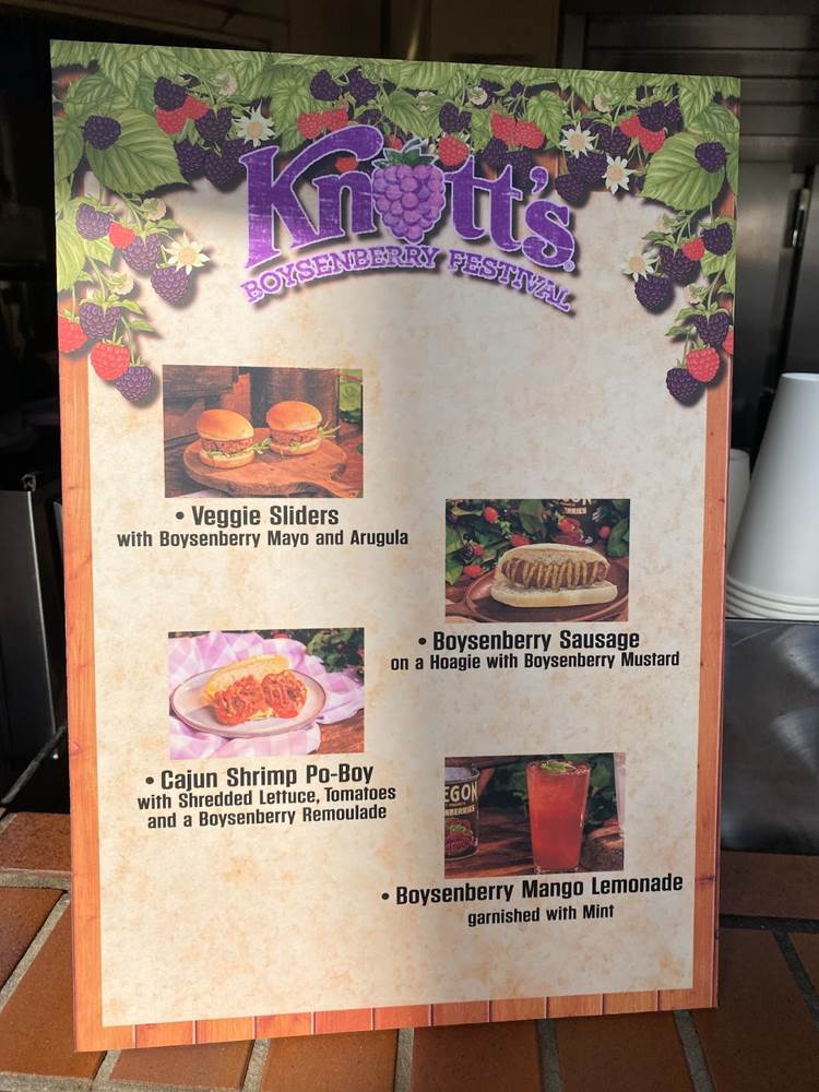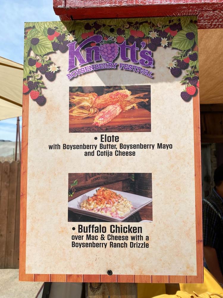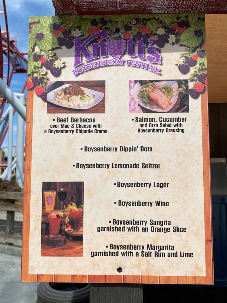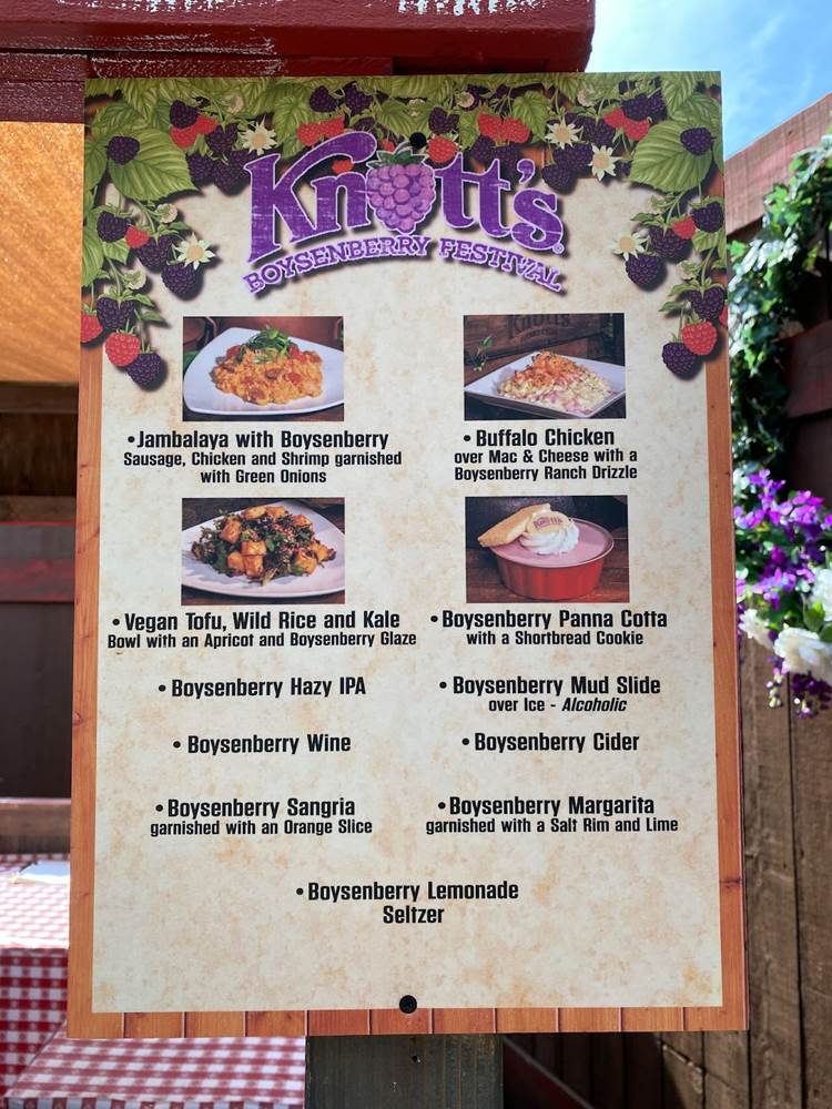But one of the biggest draws of Knott’s Boysenberry Festival is inarguably the food, and as part of our media access to the event we were provided with a Food Tasting Card, which includes six specialty items from the delectable assortment of menus around the park. The cost of the card is $55 for regular guests.