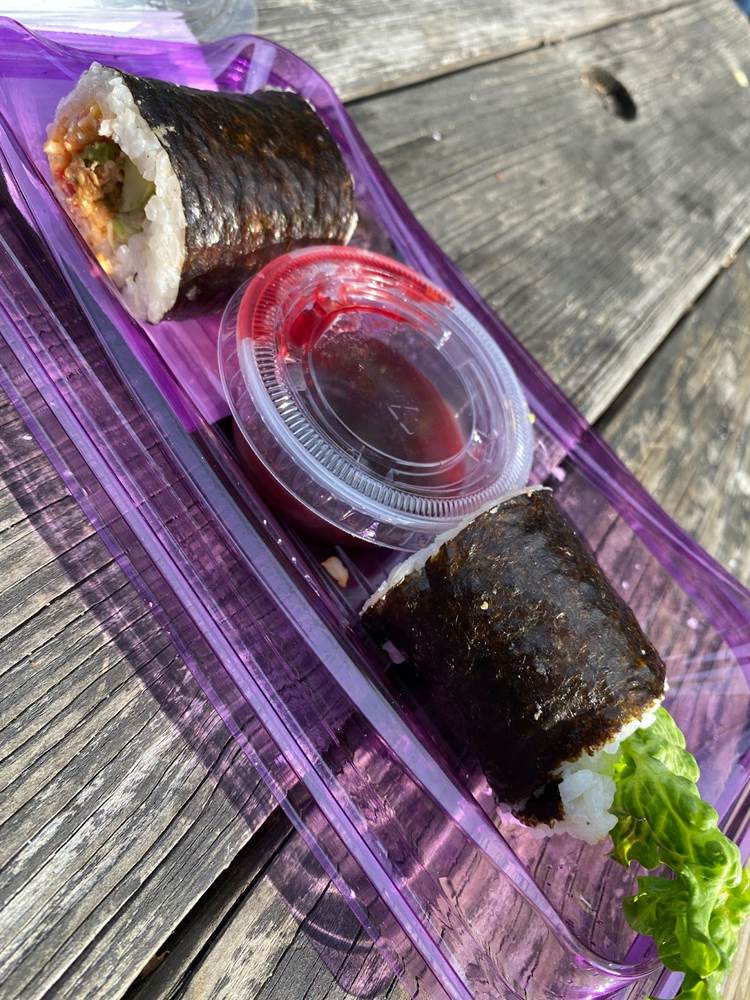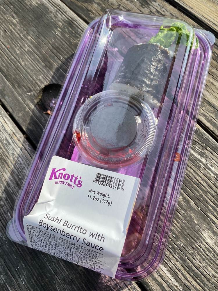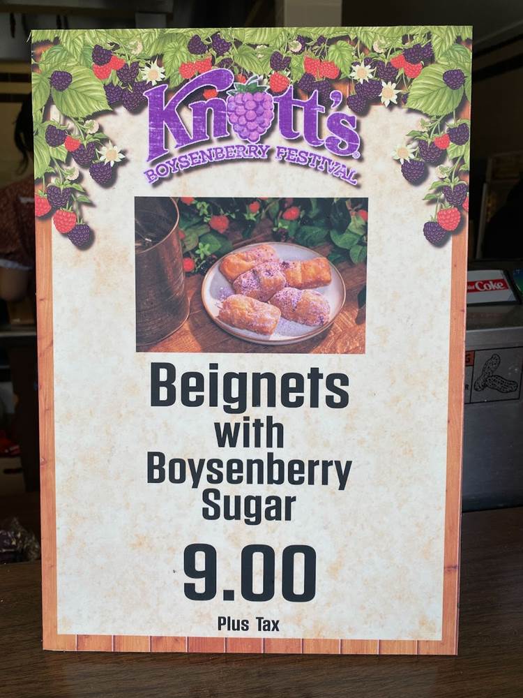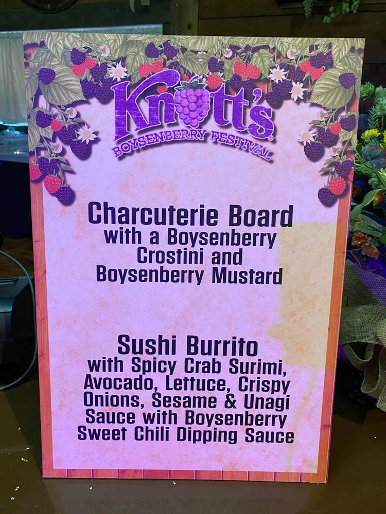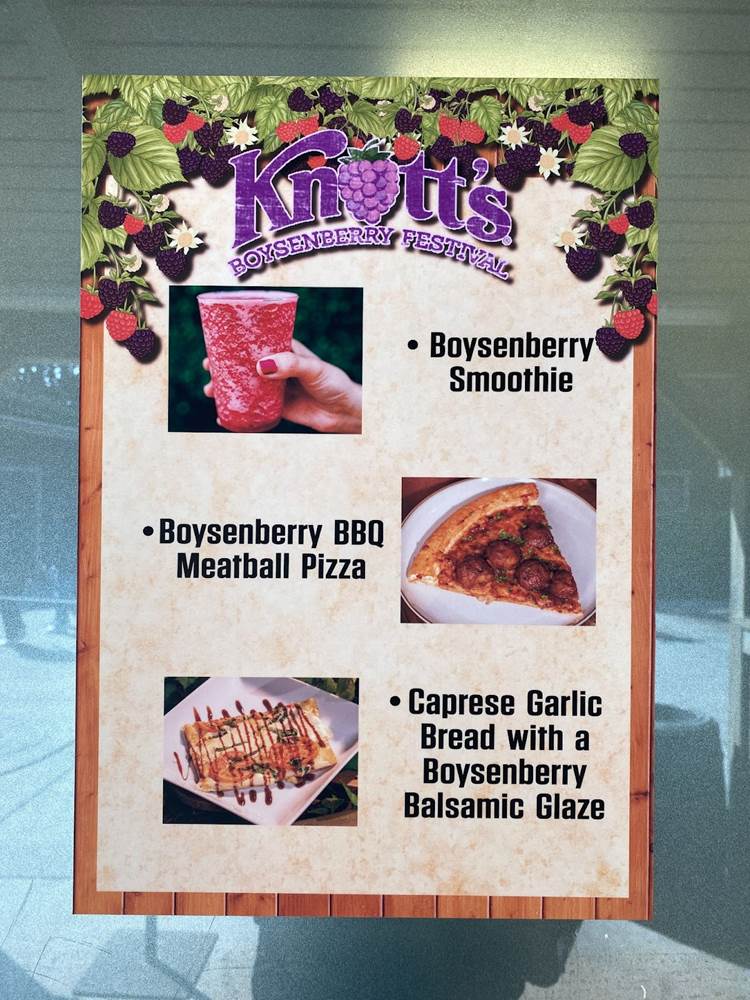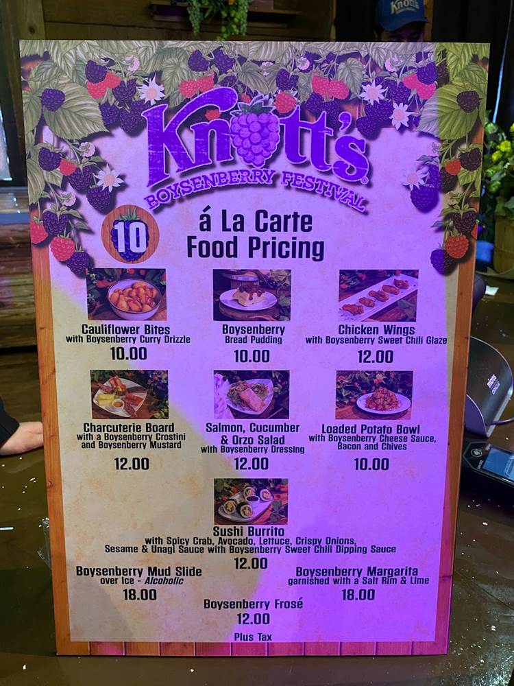 Our boysenberry-inspired culinary adventure began with Caprese Garlic Bread with Boysenberry Balsamic Glaze, and we moved through Buffalo Chicken Mac & Cheese with Boysenberry Ranch Drizzle, Boysenberry Lemonade Seltzer, the Sushi Burrito with Boysenberry Sweet Chili, a Boysenberry Ice Cream Cookie Sandwich, and to top it off a refreshing Boysenberry Margarita. Below you can see some of the food signage posted around the park along with the a-la-carte prices for each item without the Tasting Card.