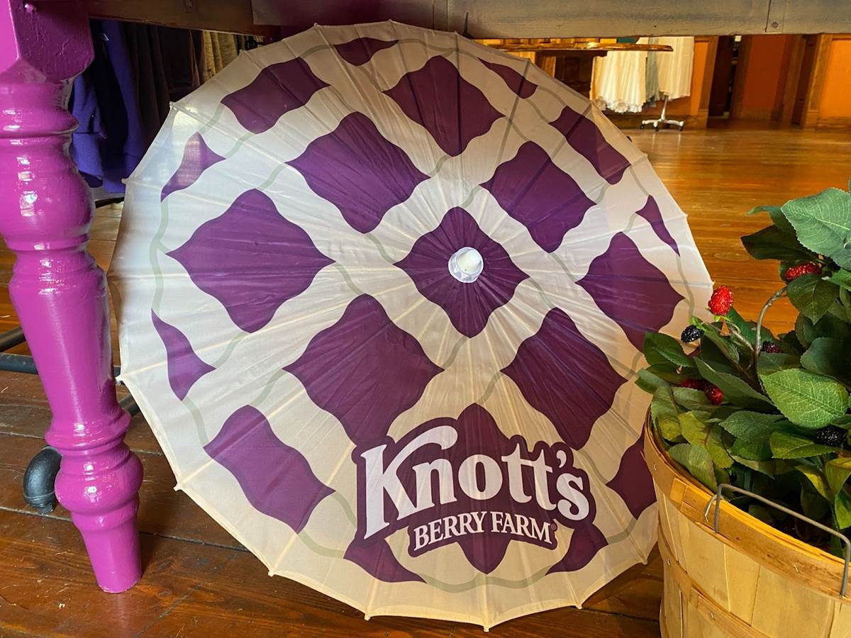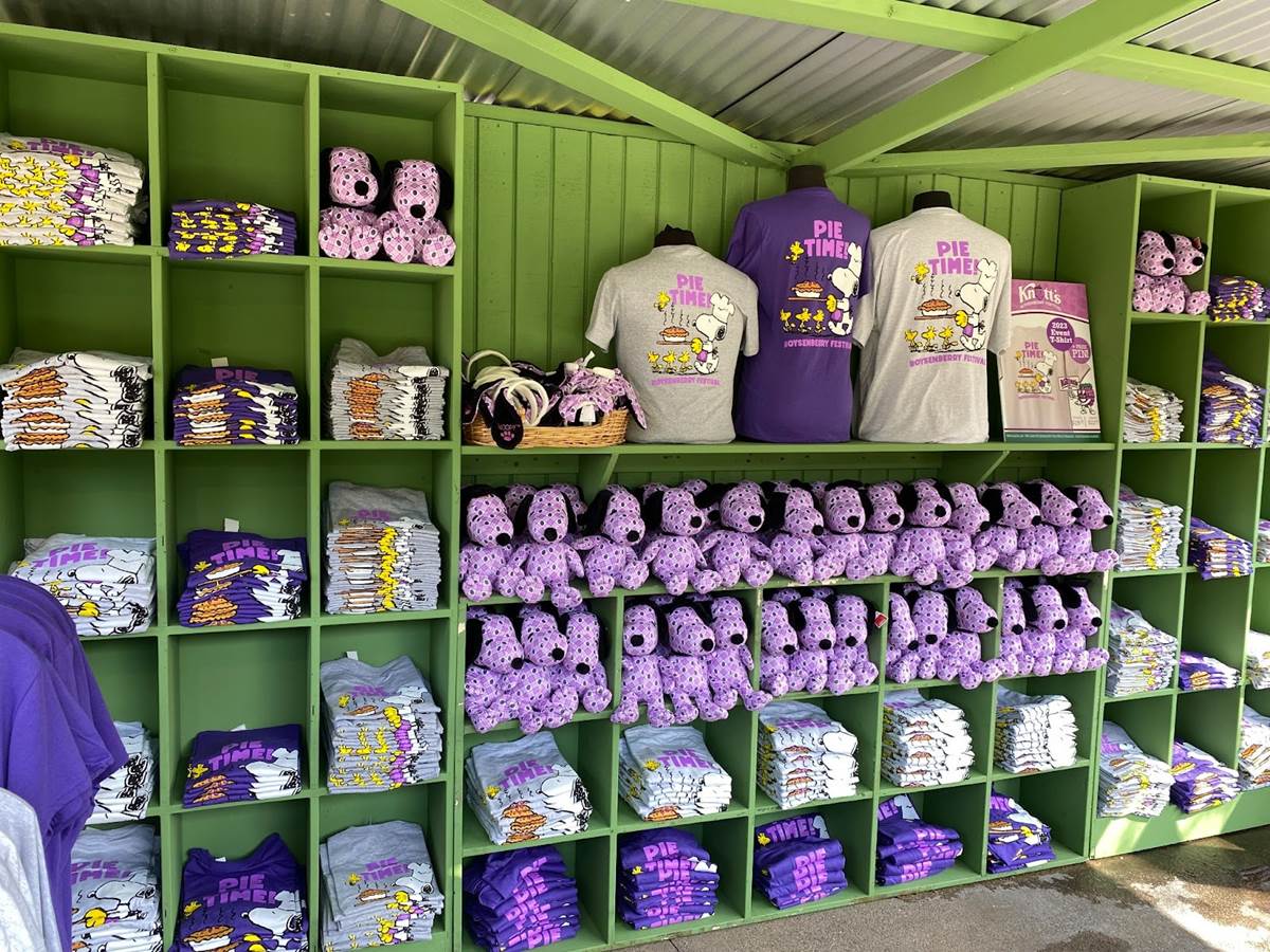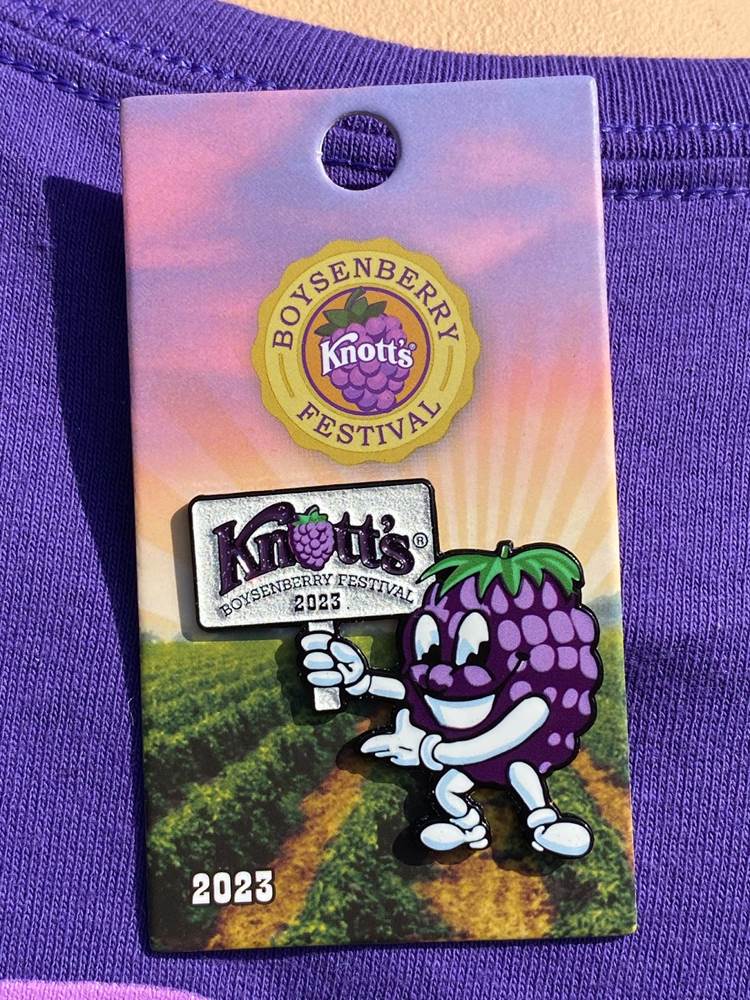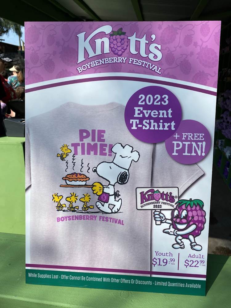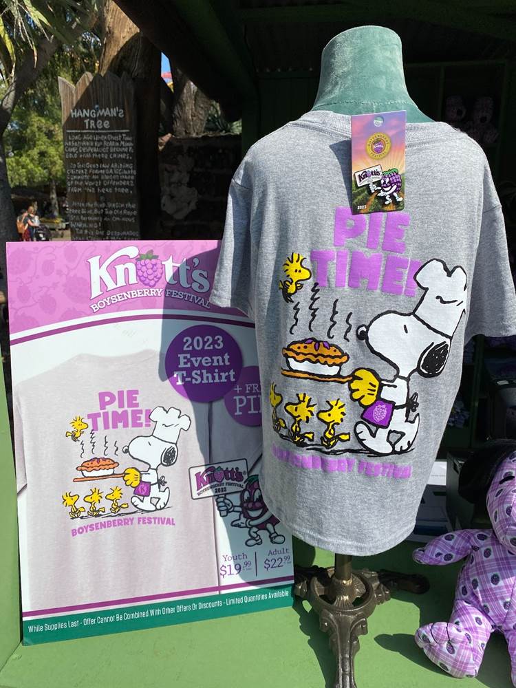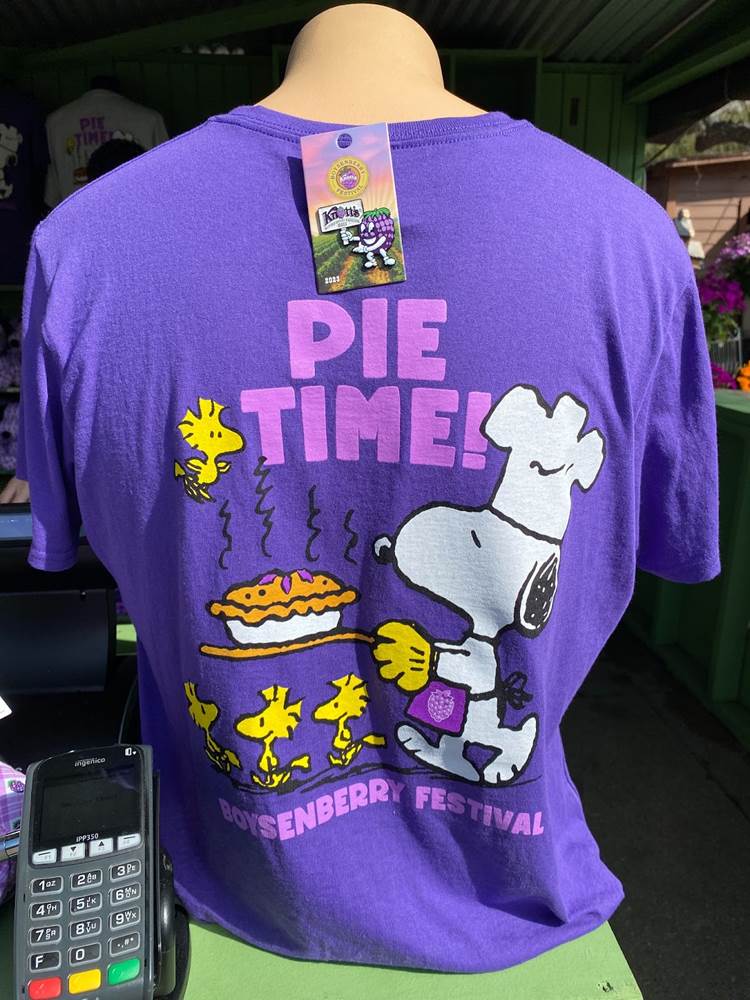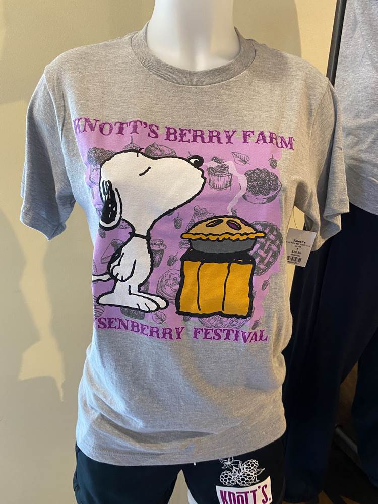 In addition to food, Knott’s Boysenberry Festival has also become known for its wonderful merchandise offerings, which this year include apparel, Snoopy plushes, boysenberry-shaped purses, water bottles, and even an umbrella. As always, the t-shirt and pin combo, available near the entrance to Ghost Town, is an especially good value.