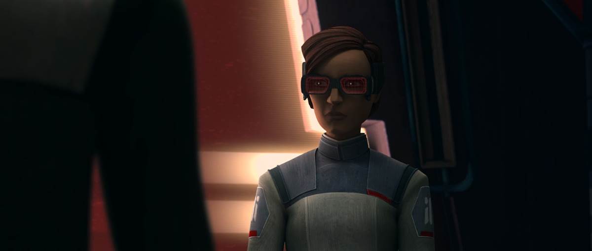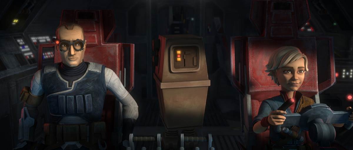 “Tipping Point" begins with Echo and Captain Rex (both voiced by Dee Bradley Baker, as are all the male clones of Jango Fett) boarding an Imperial transport ship to retake some captured clone troopers, who later claim to Senator Chuchi (Jennifer Hale) that they were taken into custody for daring to question their orders under the Empire. Meanwhile at Mount Tantiss, Crosshair is administered a grueling interrogation by Doctor Hemlock (Jimmi Simpson), but when left under the slightly less draconian supervision of stormtroopers and Emerie Karr (Keisha Castle-Hughes), he is able to stage a short-lived escape. During his brief egress, Crosshair is able to send a message to the Bad Batch informing them of what Hemlock is after– Omega’s location, naturally. And speaking of Omega (Michelle Ang), she and her pals are settling in nicely on Pabu, though Hunter can’t make up his mind as to whether their relocation there should be a permanent one. A visit from Echo interrupts Omega’s training session as she’s learning to fly the Havoc Marauder from Tech, who gets to work right away attempting to decrypt the data card that Echo brought with him from his and Rex’s Imperial raid.