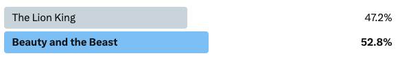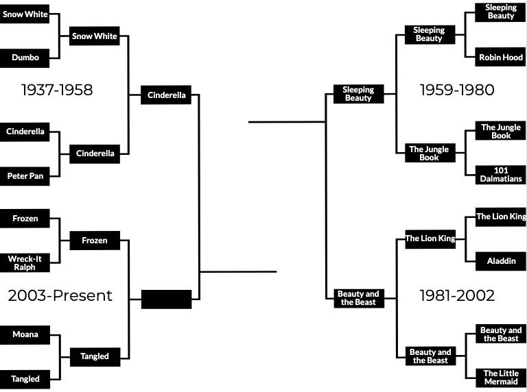 Before we move on to our next matchup, let’s take a look at our last result. In a bit of a shocker, Beauty and the Beast dethroned the top seed in the ‘81-’02 region by defeating The Lion King, 53-47. That sets up a beautiful Final 4 matchup against Sleeping Beauty.