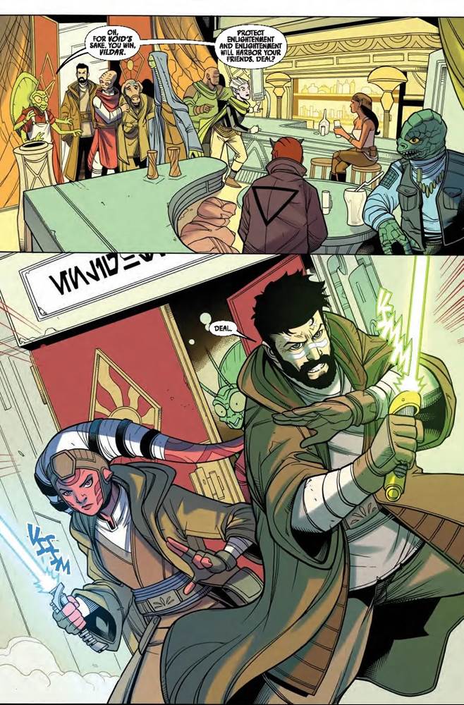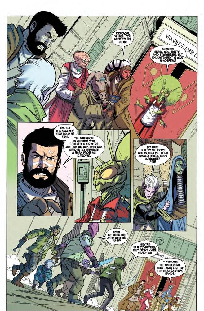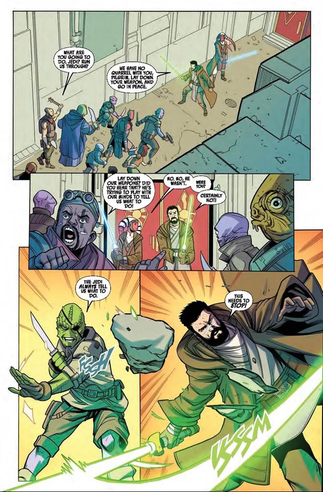 As The High Republic #7 begins, riots are spreading in the streets of Jedha City, and Jedi Master Vildar Mac has partnered with Twi’lek Padawan Matthea “Matty" Cathley to bring survivors of the collapse of the Path of the Open Hand almshouse to safety at the local tapbar known as Enlightenment. At first, the bar’s proprietor– an insect-like Villarandi named Kradon Minst– is hesitant for his establishment to serve as a refuge for those escaping the riots, but after some persuading (not to mention the promise of Jedi protection), Kradon gives in and Enlightenment truly becomes the haven the shrewd entrepreneur had always insisted it was. As the survivors gather inside, Vildar and Matty stay in the alleyway entrance to the bar to fend off any attackers, a plan that ends with Mac having to collapse a wall with the Force just to keep people from overwhelming them. Meanwhile, at the fallen Jedi statue known as the “Final Protector" out in the Jedha desert, Jedi Knight Oliviah Zeveron and Jedi Master Leebon protect the monument from mysterious, heavily-armored raiders who want something that might be buried underneath it. Back at Enlightenment, we learn from former Guardian of the Whills Tey Sirrek: the Rod of Daybreak, a Force artifact that a select few Jedi have kept secret on the so-called Pilgrim Moon.