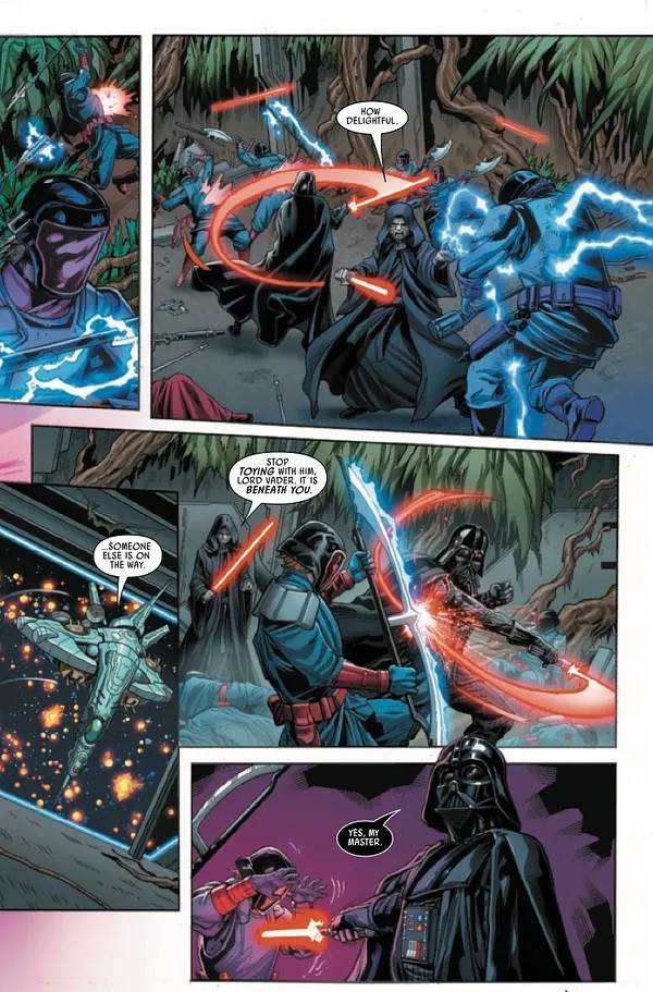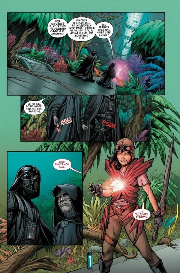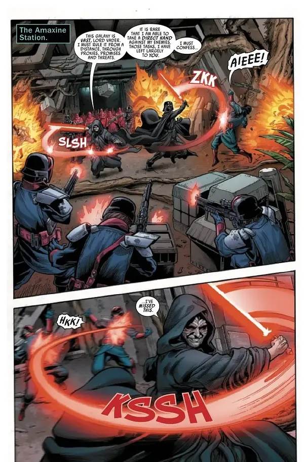 Hidden Empire #5 begins with Darth Vader and his master Emperor Palpatine (AKA Darth Sidious) having boarded the Amaxine space station– first seen in Soule’s The Rise of Kylo Ren miniseries and then in author Claudia Gray’s Star Wars: The High Republic - Into the Dark novel– as the legendary Fermata Cage prepares to open.