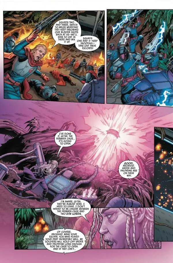 The two Sith Lords slice their way through an army of Crimson Dawn soldiers, while the Archivist makes the final preparation for the surreptitious trap that Qi’ra has set for them. But one last obstacle stands in their way that Palpatine and Vader hadn’t prepared for: the rogue archaeologist Doctor Chelli Lona Aphra, having been possessed by the evil artificial intelligence known as the Spark Eternal. The Spark-controlled Aphra has taken possession of an Ascendant weapon called the Null Blade, though Vader is able to make quick work of it, subsequently banishing the A.I. from Chelli’s body by dramatic use of the Force. Vader then gets distracted from dealing with his former assistant by Palpatine’s approach to the Fermata Cage, which Qi’ra has managed to trick them into believing contains an ancient Sith Lord frozen in time. Instead, the Crimson Dawn leader plans to trap them within the Cage, with the later intent of hurling the mystical device into a sun. And this plan actually seems to be working for a quick few minutes, until the intervention of the Knights of Ren, who have decided that their allyship with Qi’ra has never quite payed off in the way they were promised.