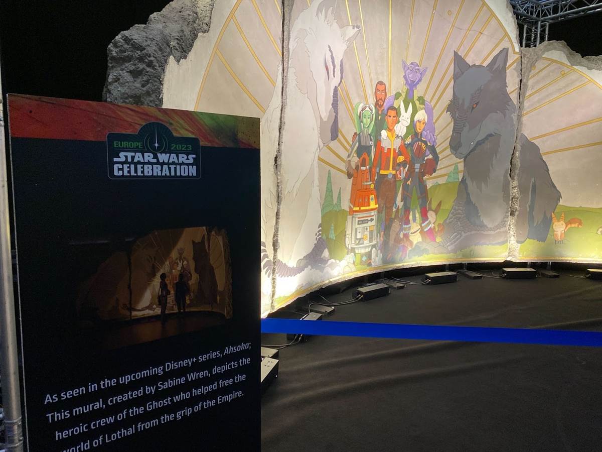 The panel wrapped up with another look at the sizzle reel for season two they had already shown this morning, and then it was time for one more trip through the floor before returning for The Mandalorian screening at 6:00. There’s so much to see on the floor (and the layout of the ExCeL Center combined with the congestion of the crowd made it difficult to see everything in one day) so I’m looking forward to doing more of that in the coming days, but one thing that did jump out at me was Sabine Wren’s painted mural from Star Wars Rebels and Ahsoka, which is available for photo ops.