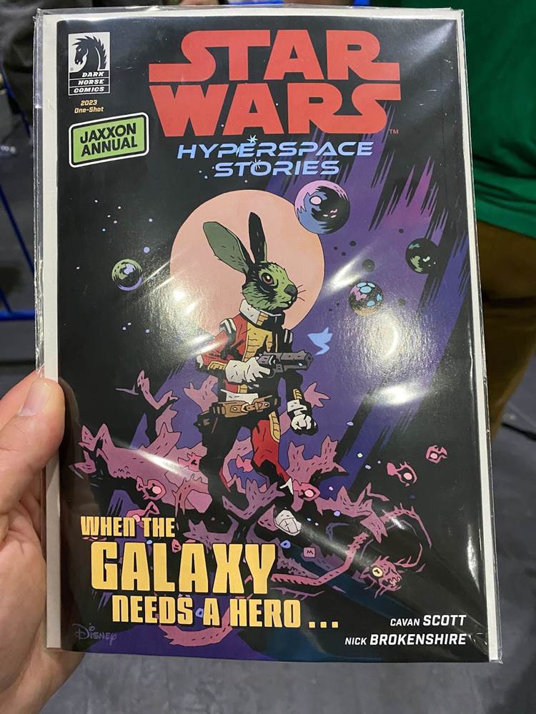 These are the things that stood out to me in my memory of the past day: it started back on the exhibit hall floor, where I was finally able to get into the Forbidden Planet booth and pick up a copy of the exclusive Dark Horse Comics Jaxxon cover of the Star Wars: Hyperspace Stories Annual by writer Cavan Scott and artist Nick Brokenshire.