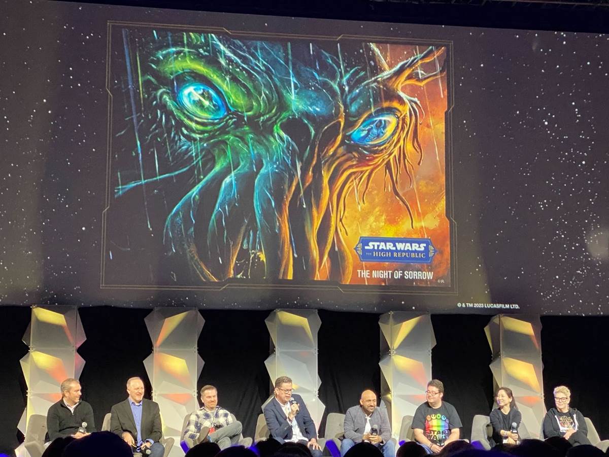 At the end of the Ahsoka panel, the creators also played a “remixed" version of the trailer with additional footage not shown in the one released online, including one shot where we could actually see Thrawn’s face. Up next I headed over to The High Republic panel on the Galaxy Stage, where we got a recap of Phase II of Lucasfilm’s ambitious multi-platform publishing initiative, followed by a preview of Phase III. Then as a surprise at the very end of the presentation after the live stream concluded, The Acolyte showrunner Leslye Headland came out and revealed that one of the characters from The High Republic novels– Vernestra Rwoh– would be played in live-action by Headland’s real-world wife Rebecca Henderson.
