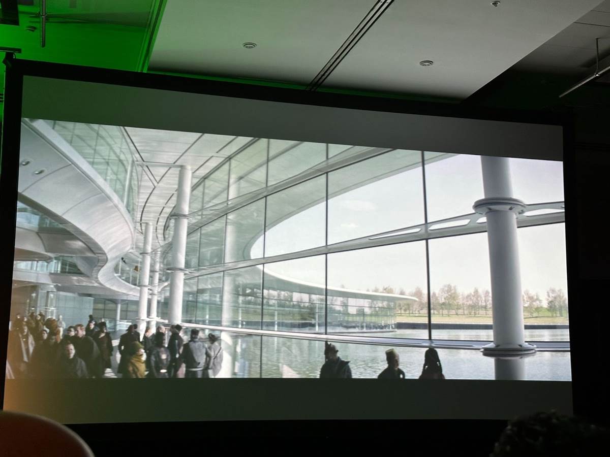 Lucasfilm Visual Effects Producer TJ Falls oversaw logistics for each shot, heavily involved in the pre-visualization phase and carrying all the way through post-production. He and Mohen Leo worked together on Rogue One and were well-versed in the style that would carry through to Andor. To help ground the series in reality, physical sets and locations were used as much as possible. TJ was part of the locations scouting team, matching up concept art with real locations that could be married together. The McLaren Technology Centre in Surrey, for example, was the location of a shipping port. The concept art didn’t have a water feature, but a lake outside of the curved windows cast water reflections onto the ceiling. Rather than remove them, the art was modified to give the terminal a water feature.