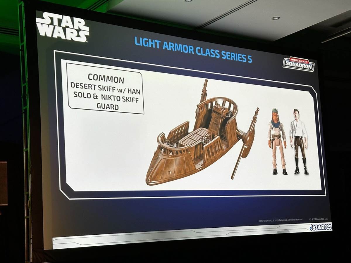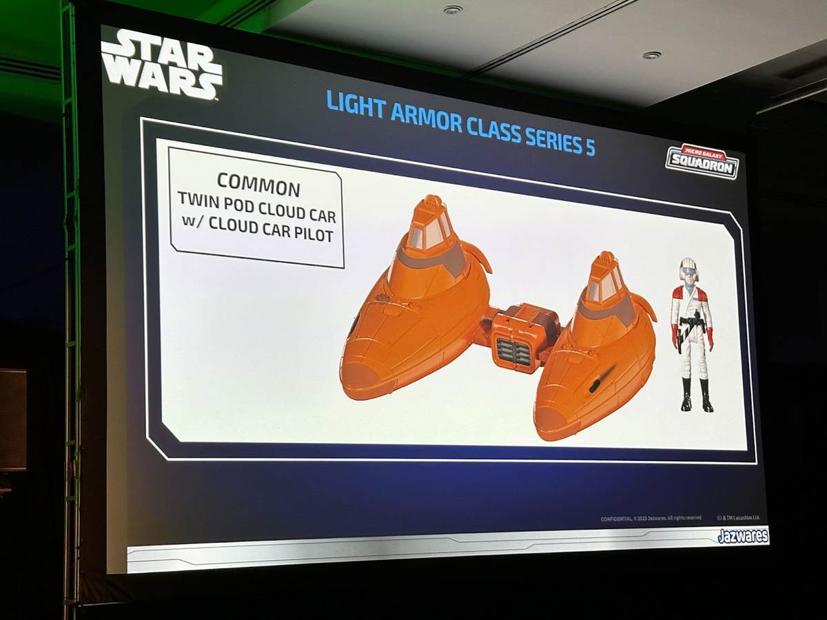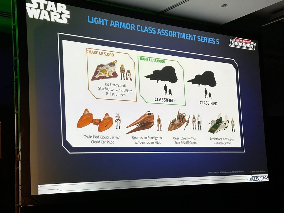 The Series V Light Armor Class includes a Twin Pod Cloud Car with Cloud Car Pilot, a Resistance A-Wing with Resistance Pilot, a Desert Skiff with Han Solo and a Nikto Skiff Guard, a Geonosian Starfighter with Geonosian Guard, and a chase of Kit Fisto’s Jedi Starfighter with Kit Fisto and an astromech droid. One of the two classified items in this wave was revealed to be a Darth Vader Jedi Interceptor, although development wasn’t far enough along to include a photo.