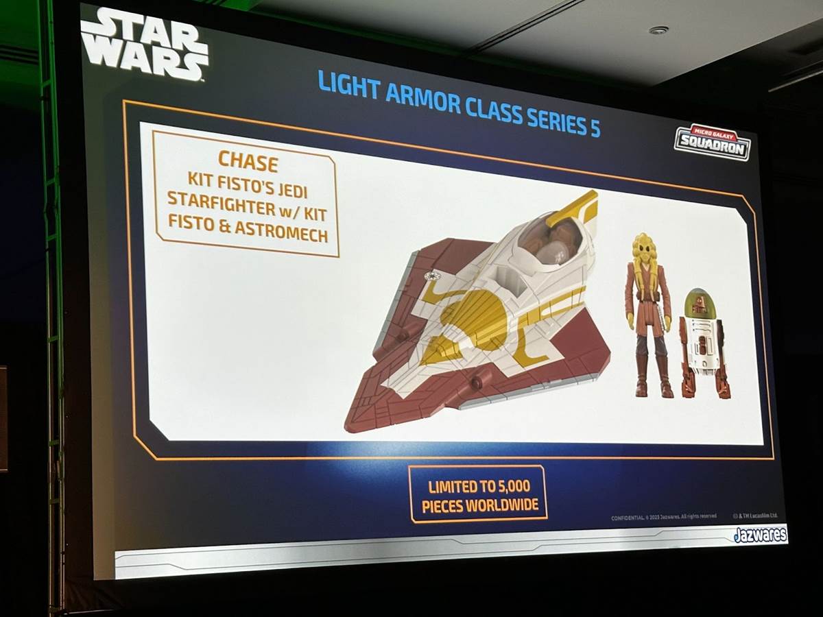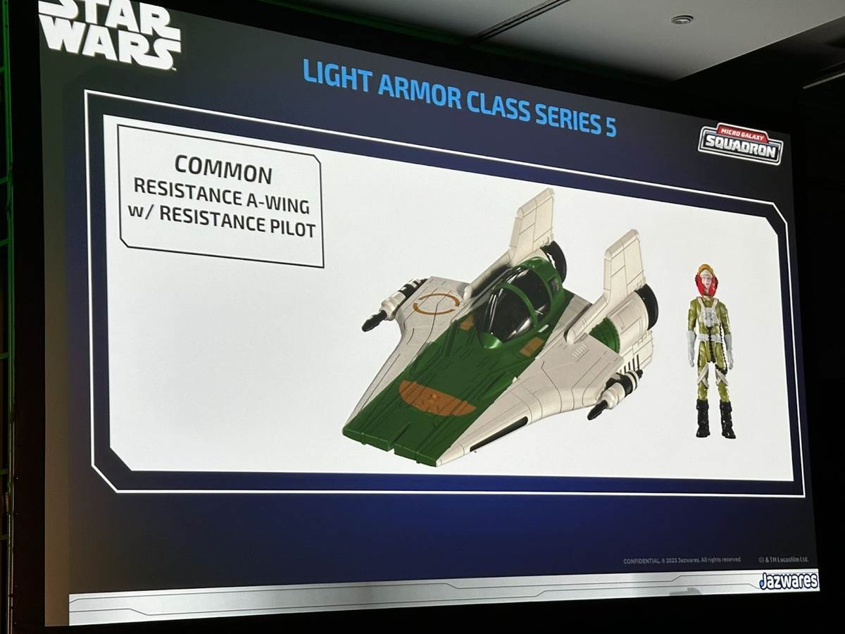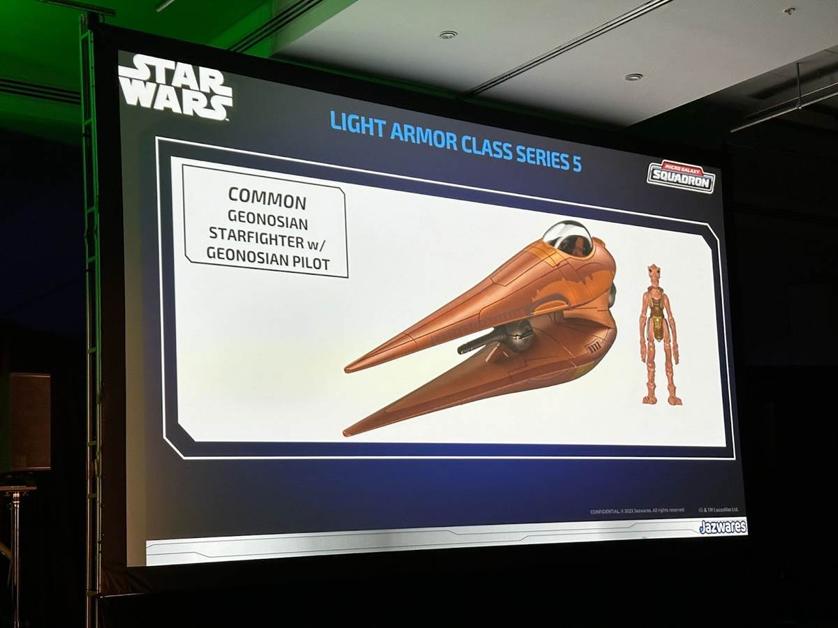 The Series V Light Armor Class includes a Twin Pod Cloud Car with Cloud Car Pilot, a Resistance A-Wing with Resistance Pilot, a Desert Skiff with Han Solo and a Nikto Skiff Guard, a Geonosian Starfighter with Geonosian Guard, and a chase of Kit Fisto’s Jedi Starfighter with Kit Fisto and an astromech droid. One of the two classified items in this wave was revealed to be a Darth Vader Jedi Interceptor, although development wasn’t far enough along to include a photo.