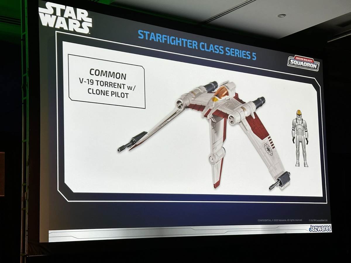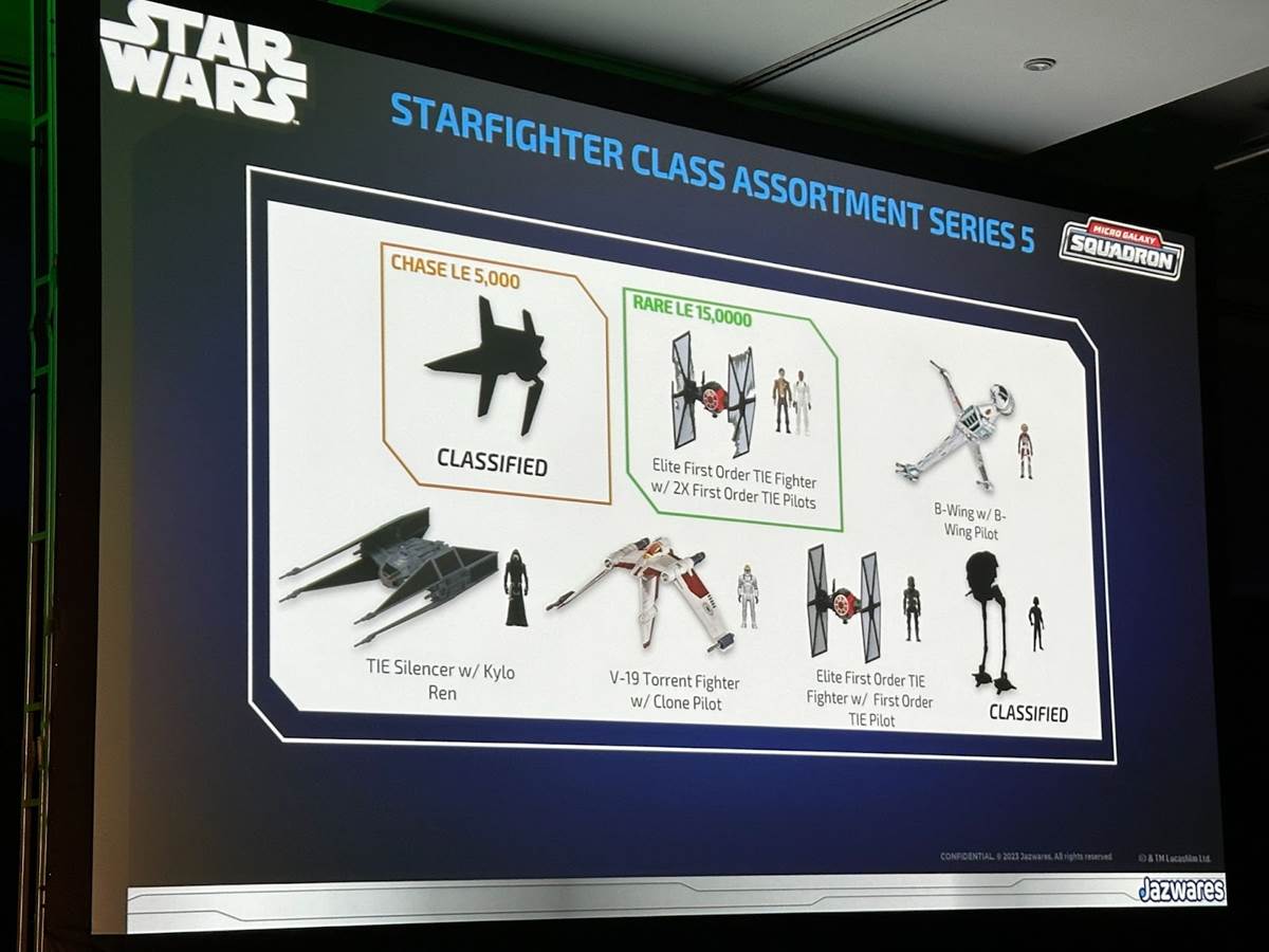 The Series V Starfighter Class includes a B-Wing Starfighter with B-Wing Pilot, a First Order TIE Fighter with First Order Pilots, a Rare Battle Damage First Order TIE Fighter with Finn and Poe, a V-19 Torrent with Clone Pilot, and a TIE Silencer with Kylo Ren. The “classified" chase from this series will be from Star Wars: Rebels, although the team didn’t say what ship it will be.