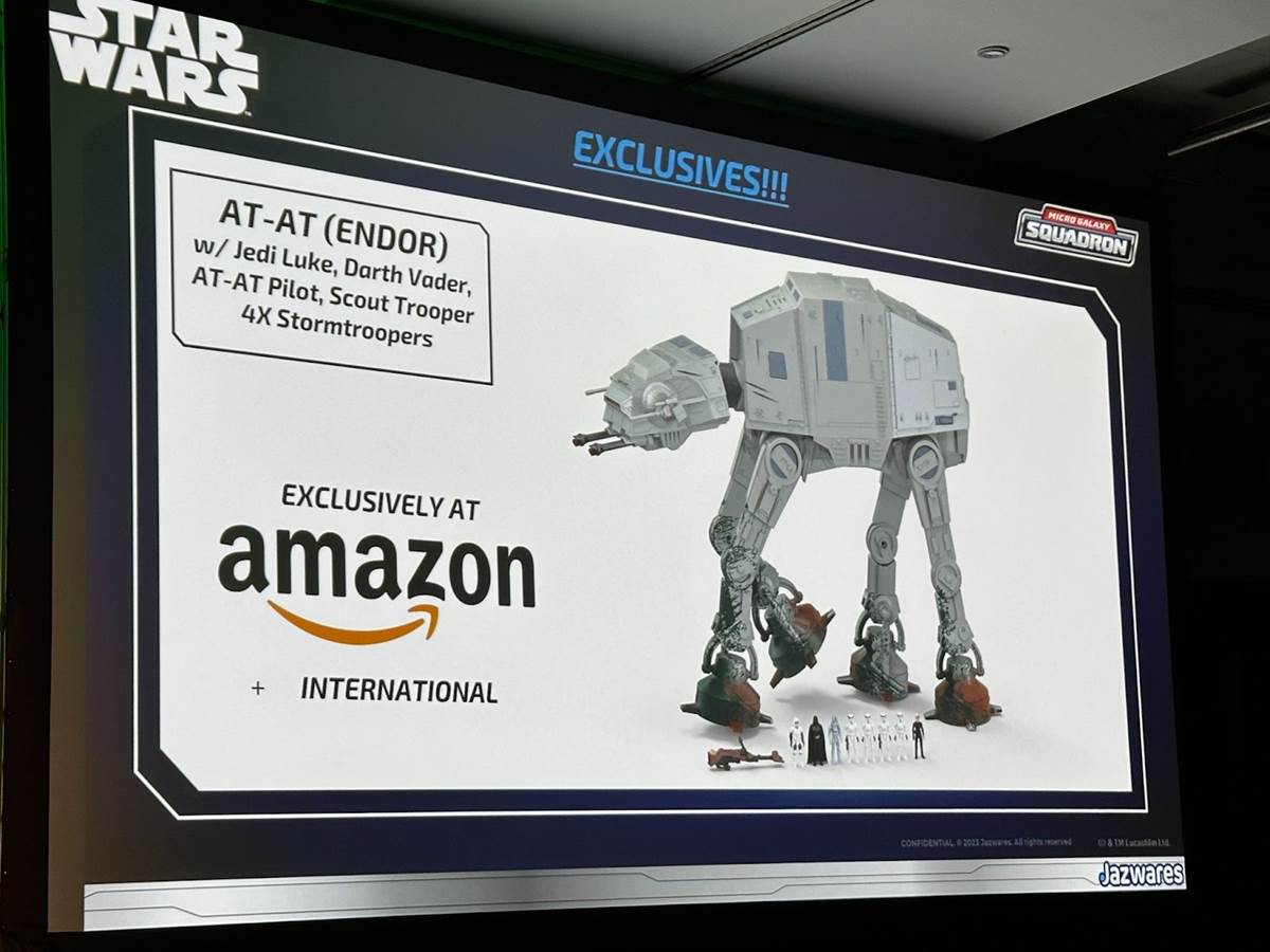 Store exclusives include an Endor version of an AT-AT with muddy feet. This one comes with Jedi Luke, Darth Vader, an AT-AT Pilot, Scout Trooper, and four Stormtroopers.