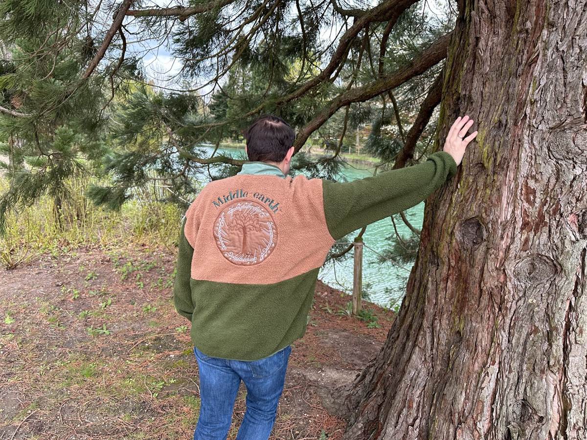 The front of the snap sweater is a little more subtle, with an embroidered Leaf of Lórien clasp like the one Galadriel gave to Frodo and the Fellowship.